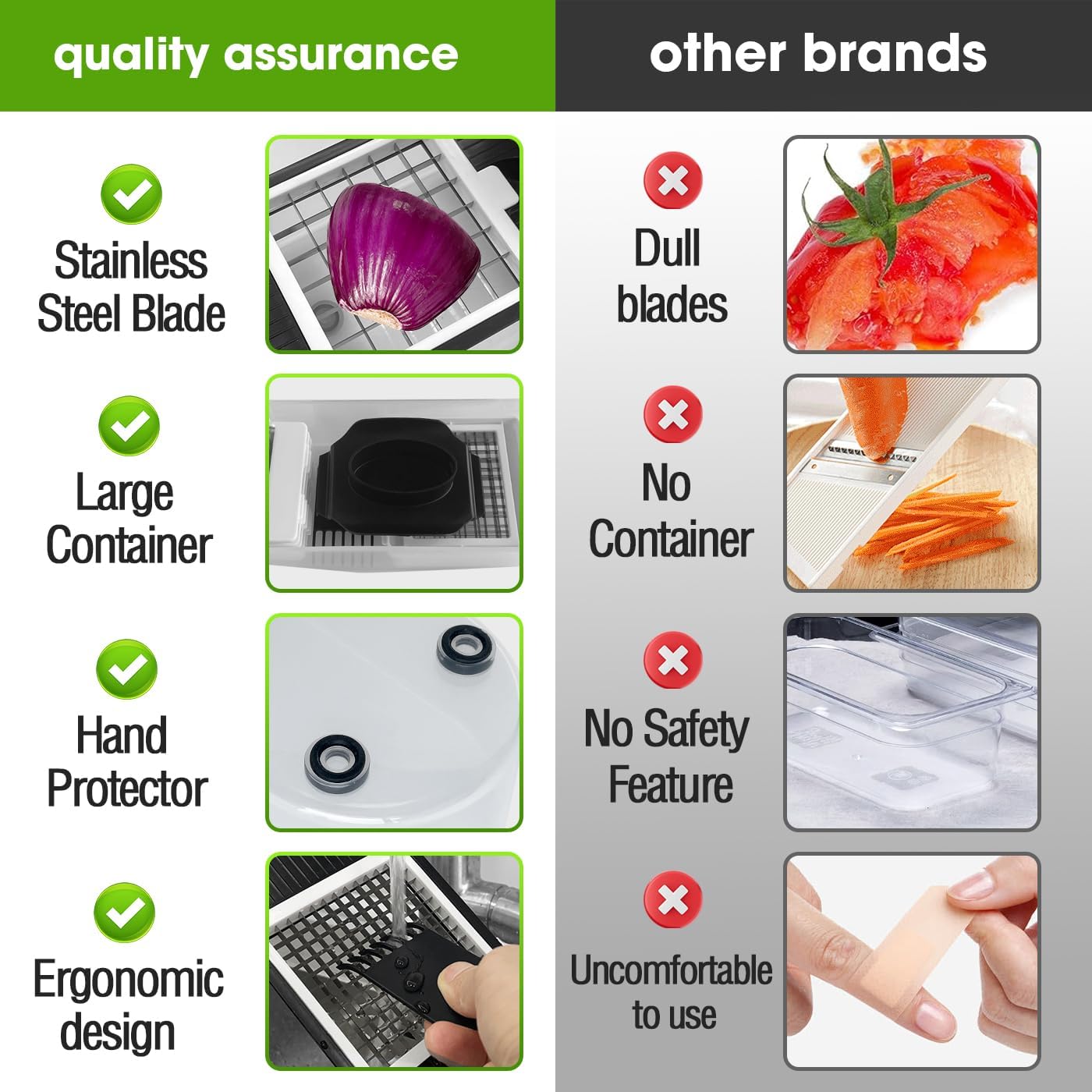 - High quality & great value - The Vegetable chopper has the function of mandolin slicer and cheese grater, and excellent quality. It includes 7 blades, 2 cleaning brush, 1 finger guard, and a 1.2L container for safe and efficient meal prepping.