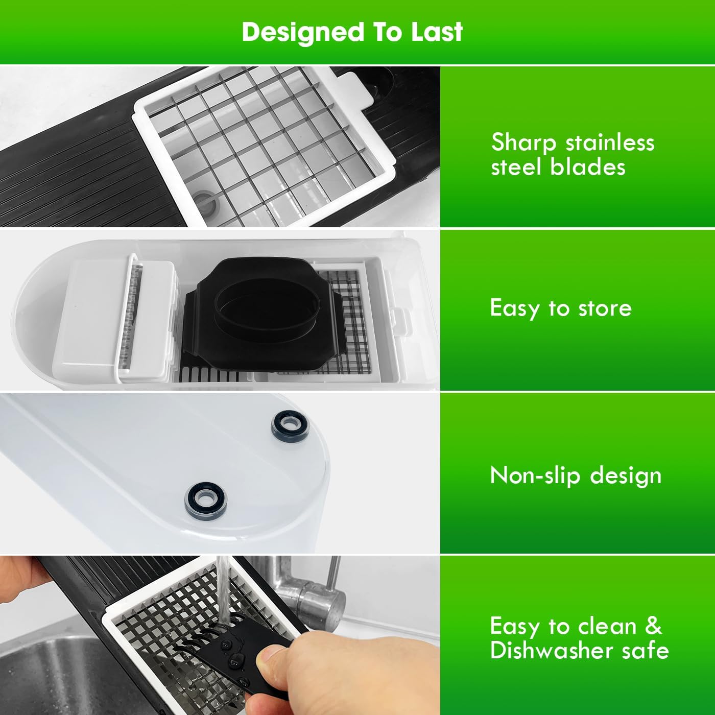- Easy to clean, dishwasher-safe - Choosing the right kitchen kools makes your life easier - our vegetable slicers, dicer, shredders are quick and easy to clean, and dishwasher-safe. The top cover is completely removable, can be thoroughly cleaned under running water, and comes with two cleaning brushes. Easily solve your kitchen chores.