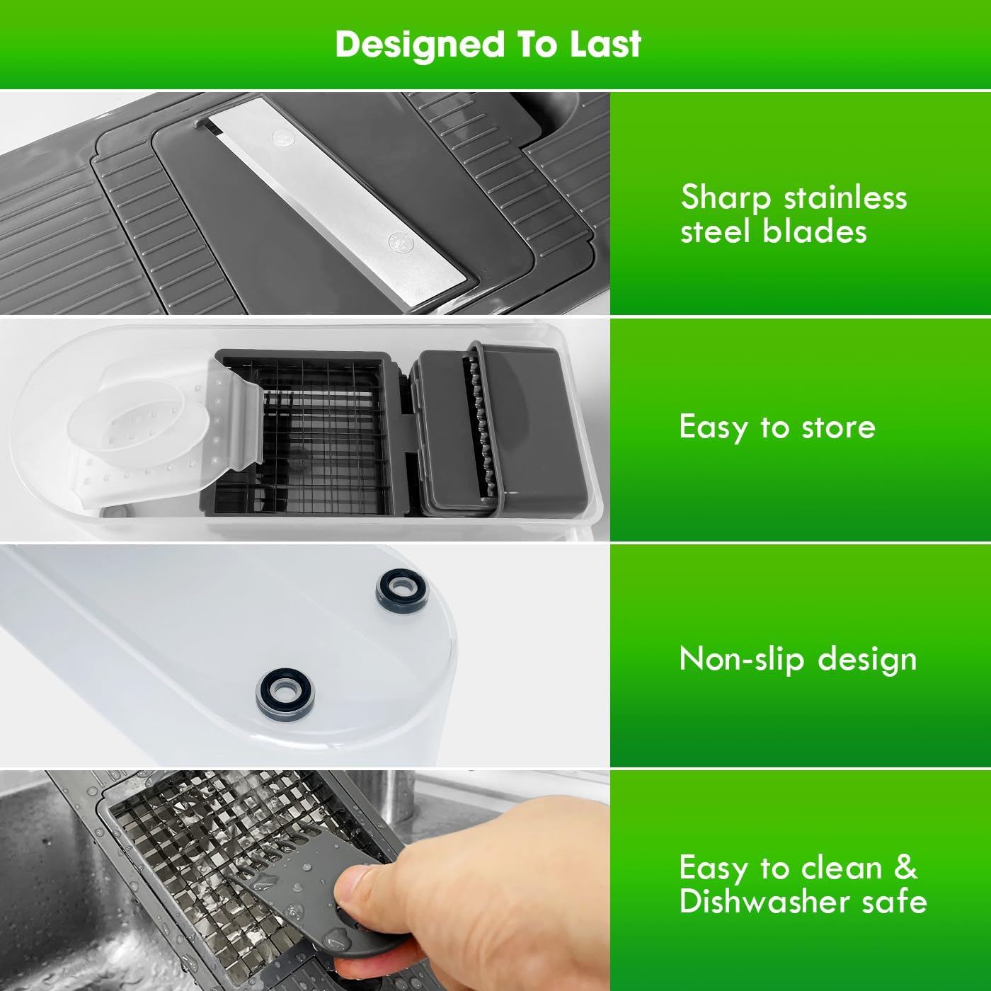 - High quality & great value - The Vegetable chopper has the function of mandolin slicer and cheese grater, and excellent quality. It includes 7 blades, 2 cleaning brush, 1 finger guard, and a 1.2L container for safe and efficient meal prepping.
