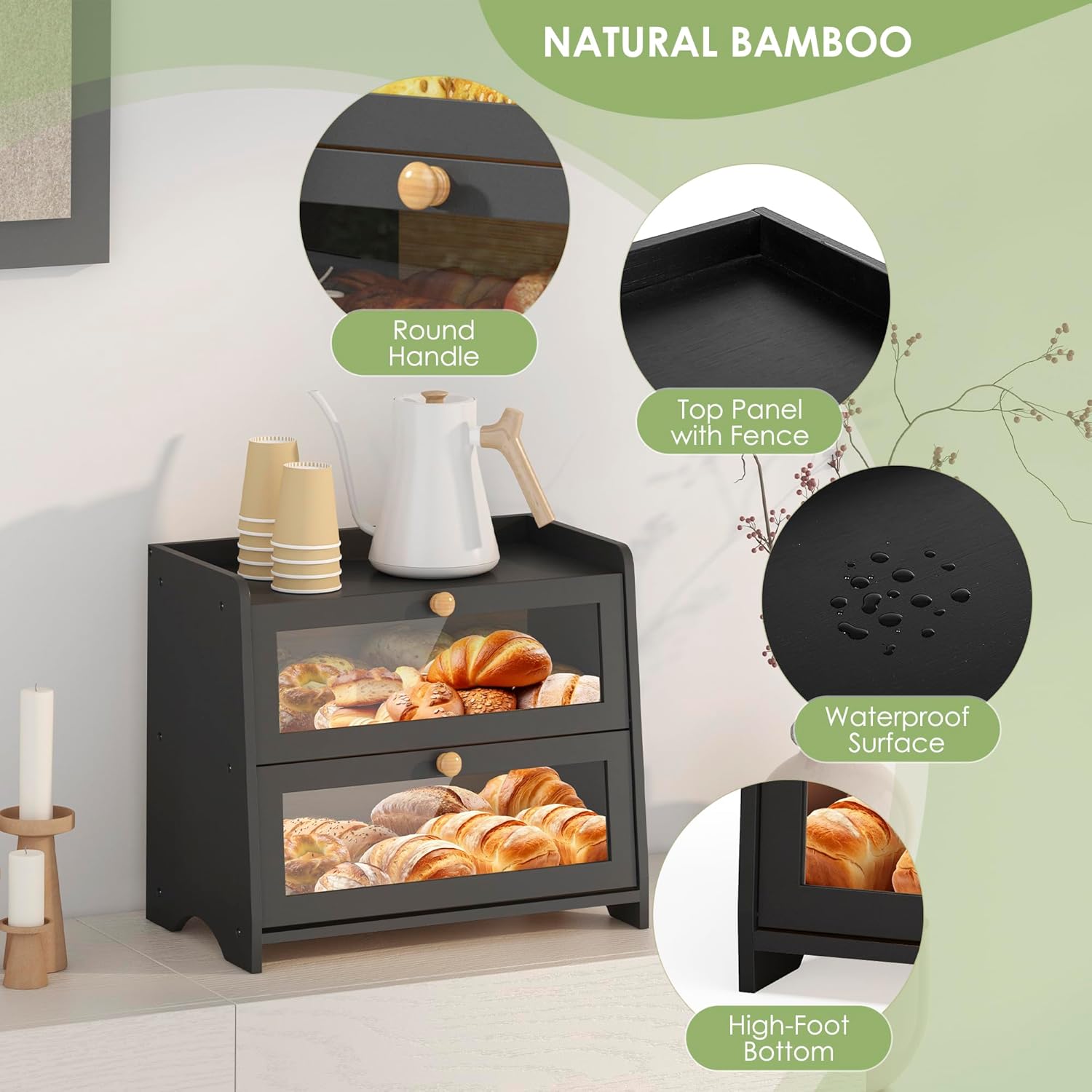 Double Layer Bread Box for Kitchen Countertop, Large Breadbox Bread with Windows, Wooden Farmhouse Bread Holder (Black)
