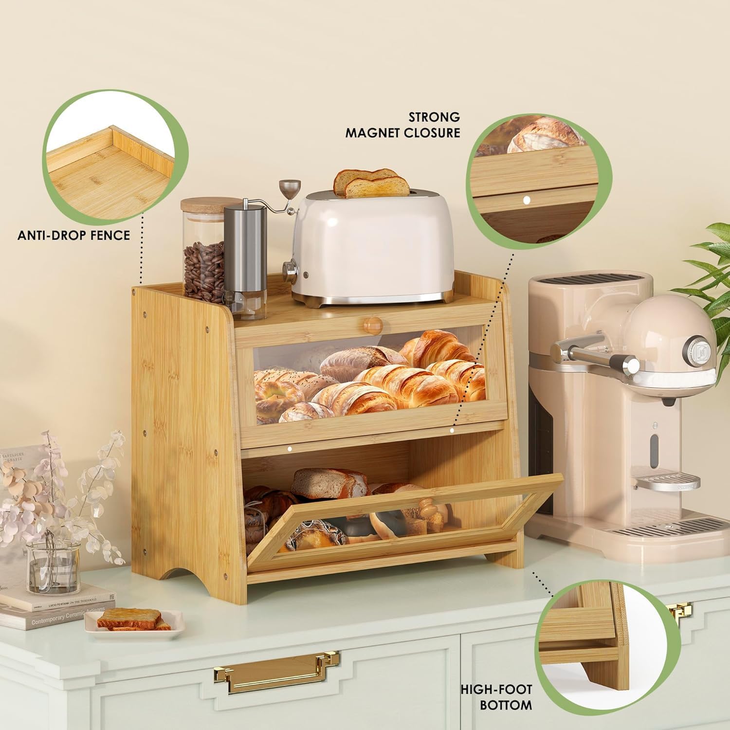 Double Layer Bread Box for Kitchen Countertop, Large Breadbox Bread with Windows, Wooden Farmhouse Bread Holder (Natural Bamboo)