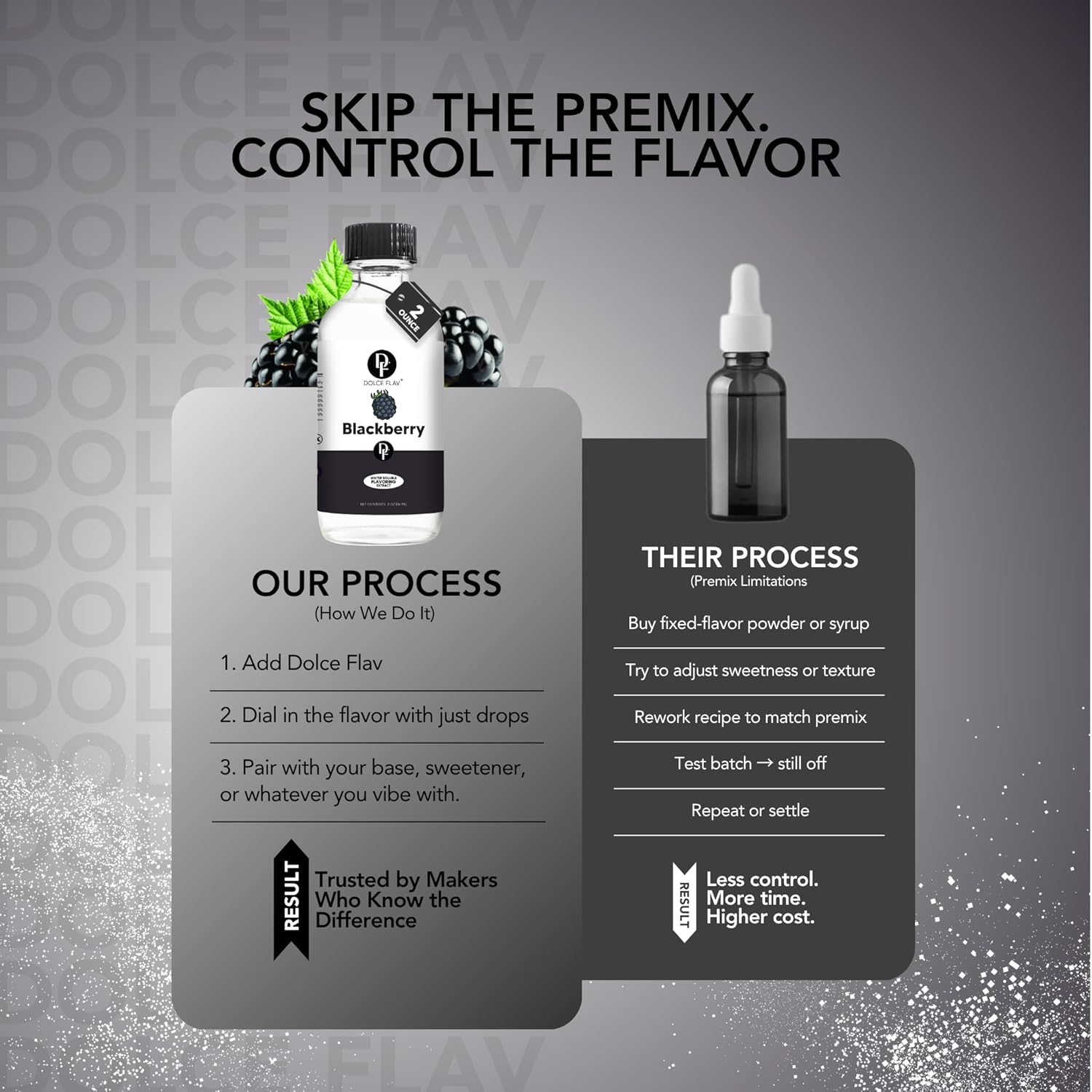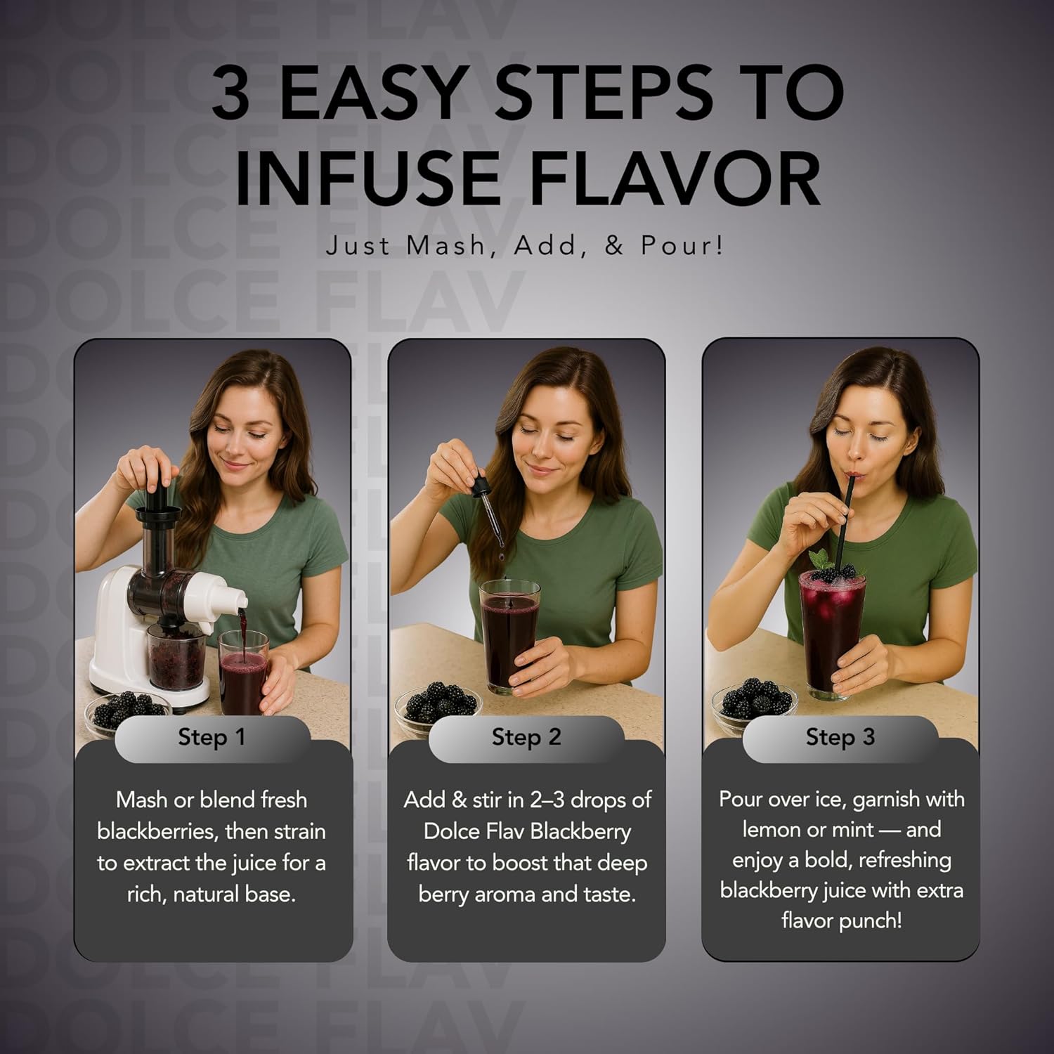 - Elevate Your Baking Adventure β Enhance your baking creations with Dolce Flav's water-based, unsweetened blackberry extract flavoring. Infuse a touch of fruity elegance into your everyday recipes, transforming your culinary experience into something extraordinary.