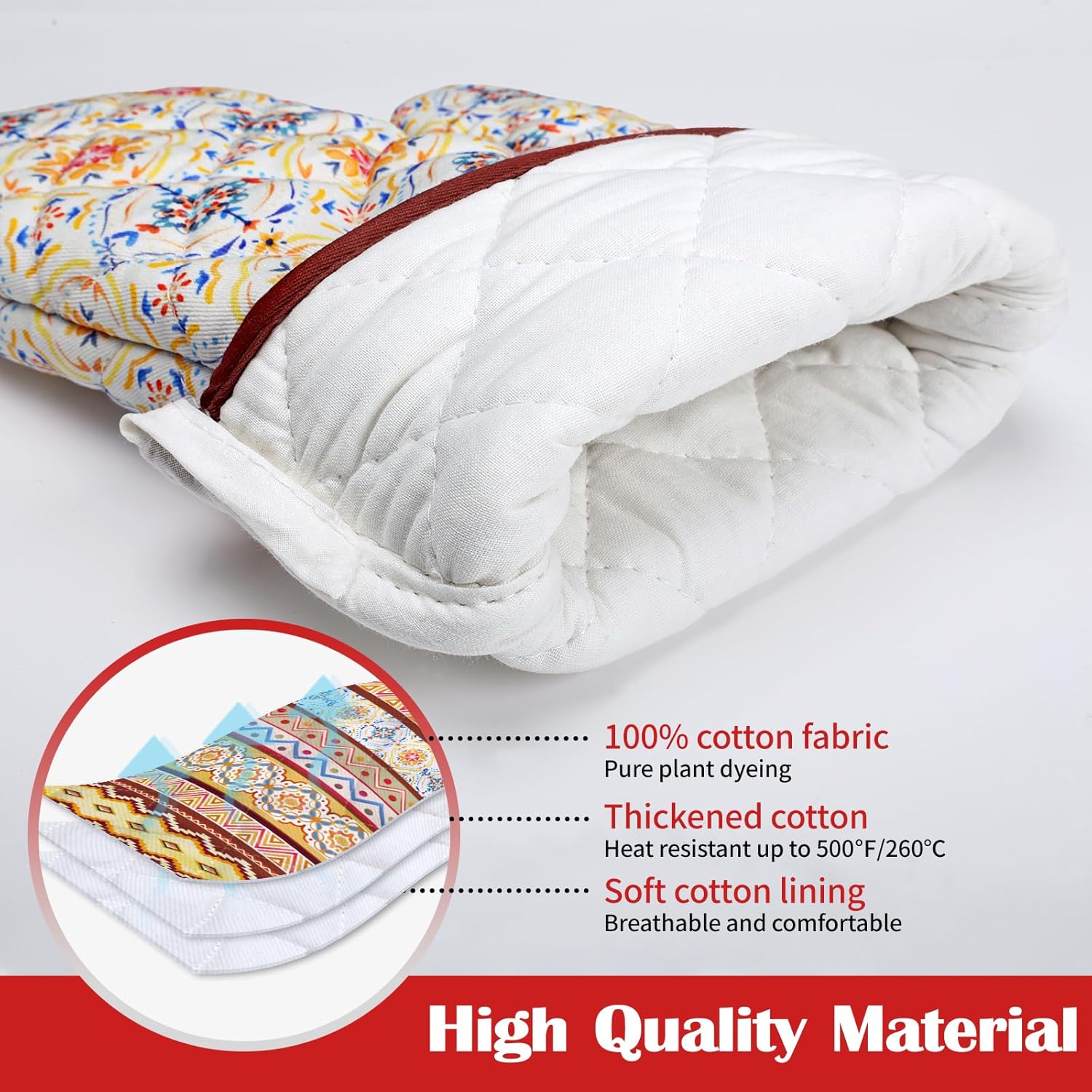 Boho Floral Oven Mitts and Pot Holders Sets 2Pcs, 100% Cotton Heat Resistant, Extra Long Oven Gloves Potholder for Kitchen Cooking Baking Decoration