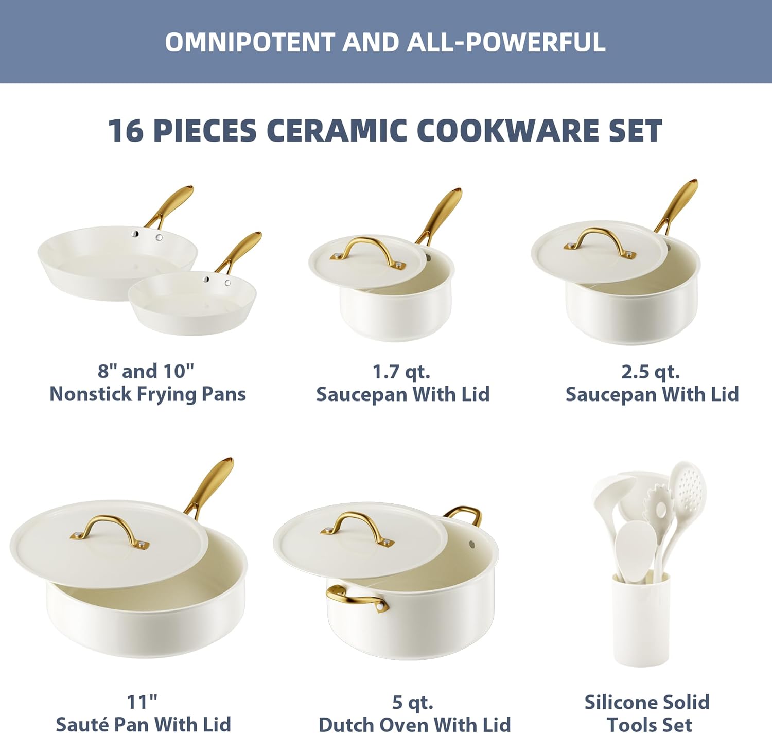 - COOKWARE SET INCLUDES: 8" and 10" non stick Frying pans, 11" Sauté pan with lid, 5QT Dutch oven with lid, 1.7QT and 2.5QT Saucepan with lid, 6 pcs cooking silicone utensils set.