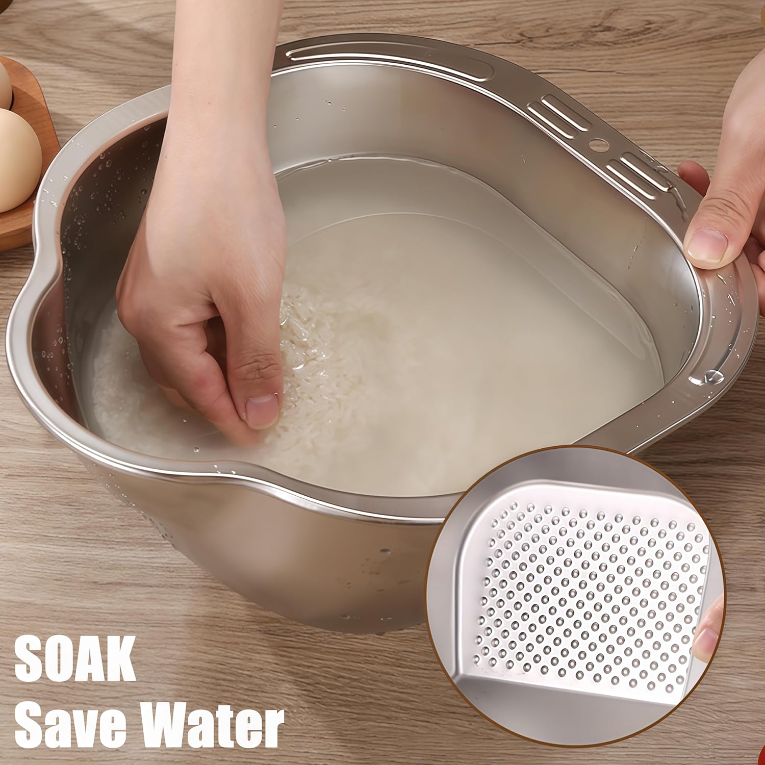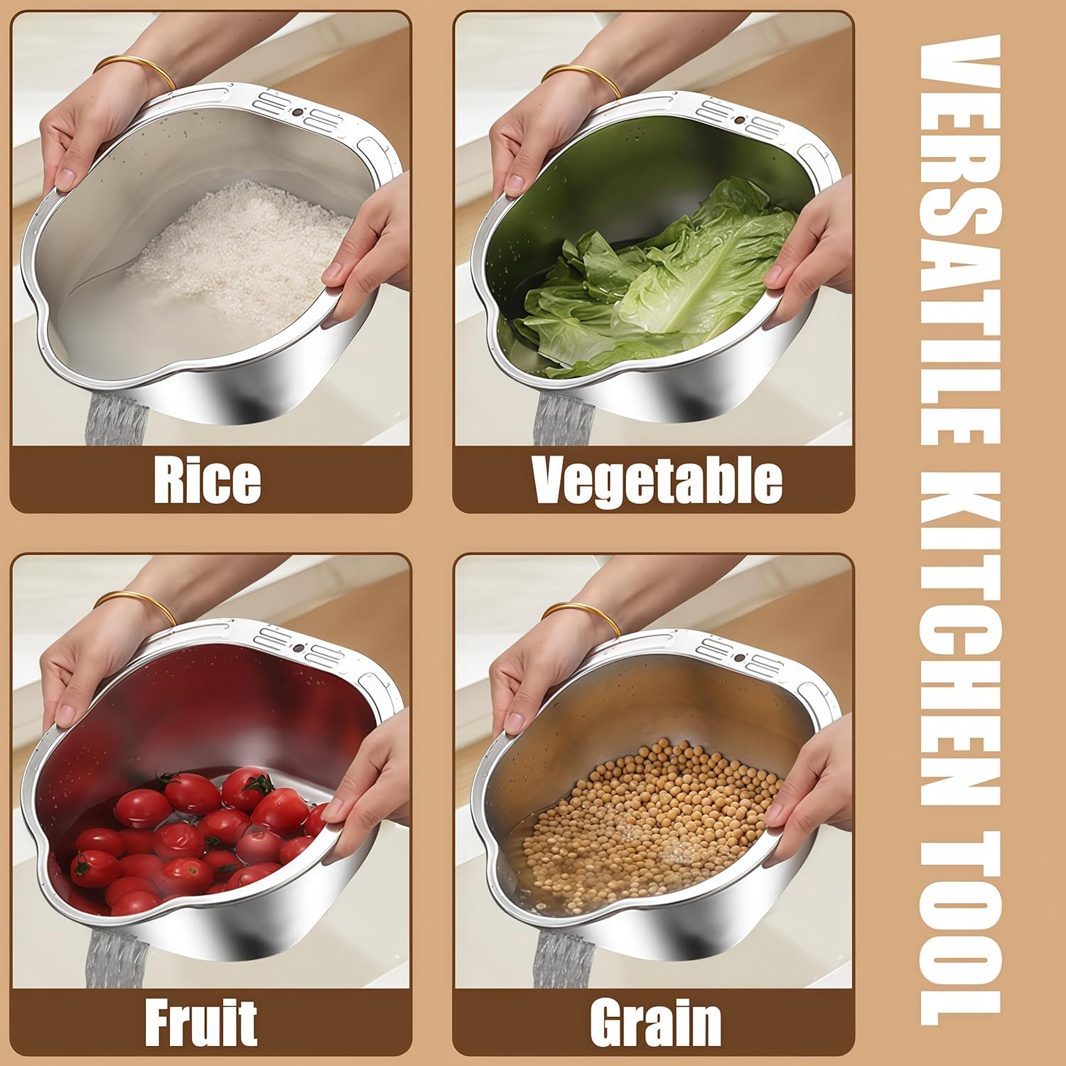 - Quick Drainage Colander Strainer: Equipped with fine drainage holes on the side, this stainless steel washing bowl ensures quick water drainage while preventing food from falling through.