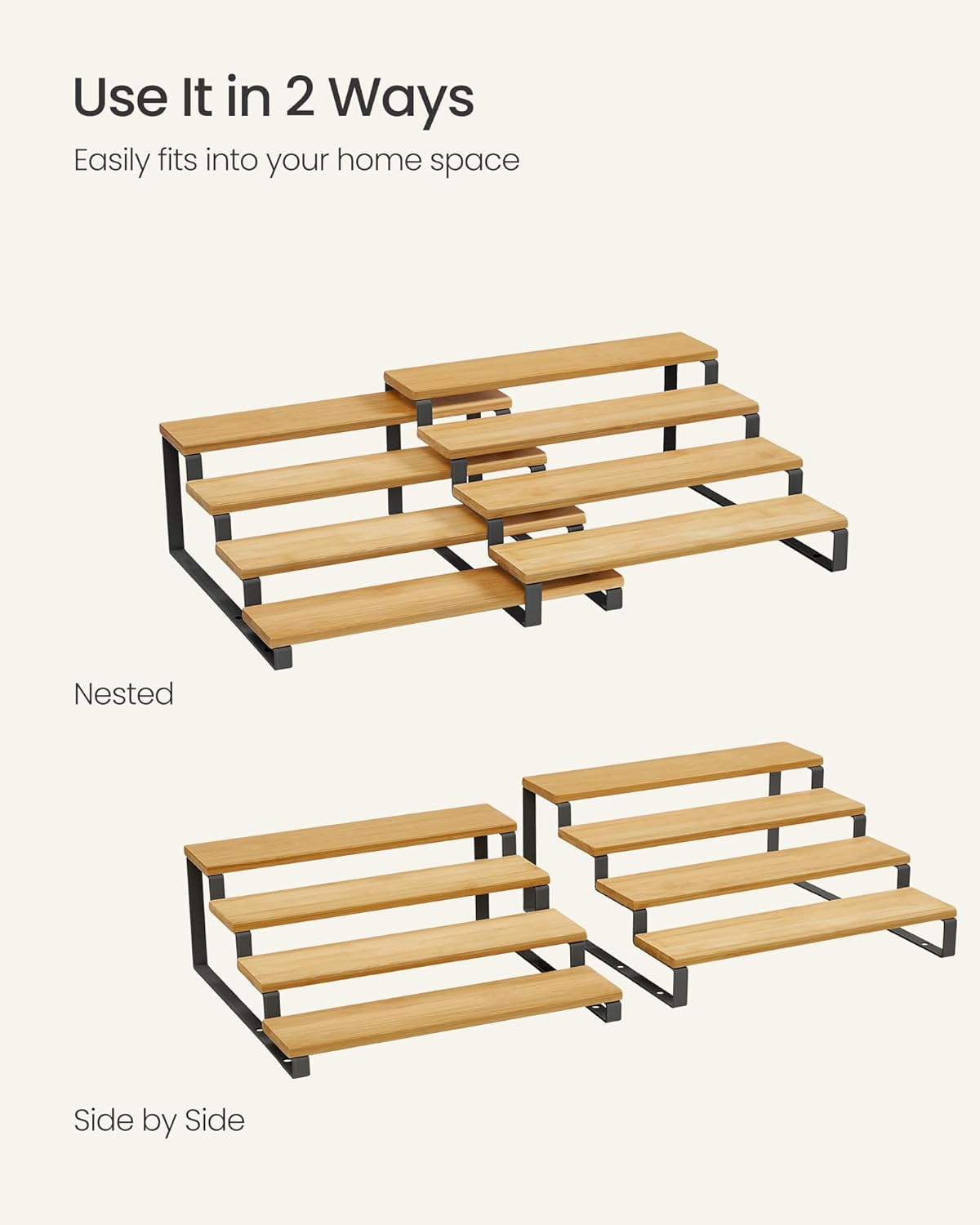 SONGMICS Display Risers, Set of 2 Engineered Wood Perfume Organizer Stand, 4-Tier Cupcake Stand Holder, Spice Rack, Shelf Risers for Figures, Dessert Shelves, Natural Beige and Ink Black UKCS216N01