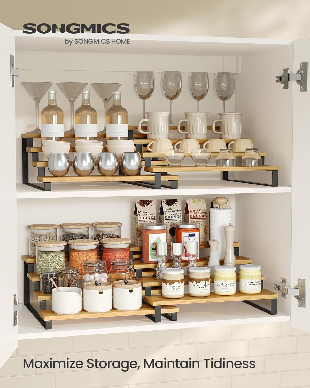 - 【STURDY AND RELIABLE】Crafted from engineered wood and metal, this tiered spice rack is sturdy and strong to support up to 6.6 lb on each tier, ensuring long-lasting use