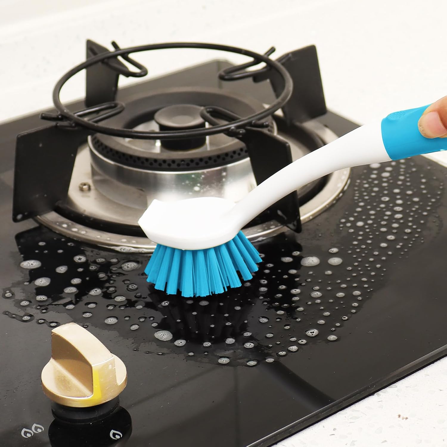 - Built-in Scraper: Dish scrubber brush with built-in scraper part, the scraper has sharpness and flatness, it can easily remove stuck-on food or tough stains on the sink, stove, pans, pots; and don't worry about scratching the surface of kitchen utensils; no need more tools and make it easier for cleaning