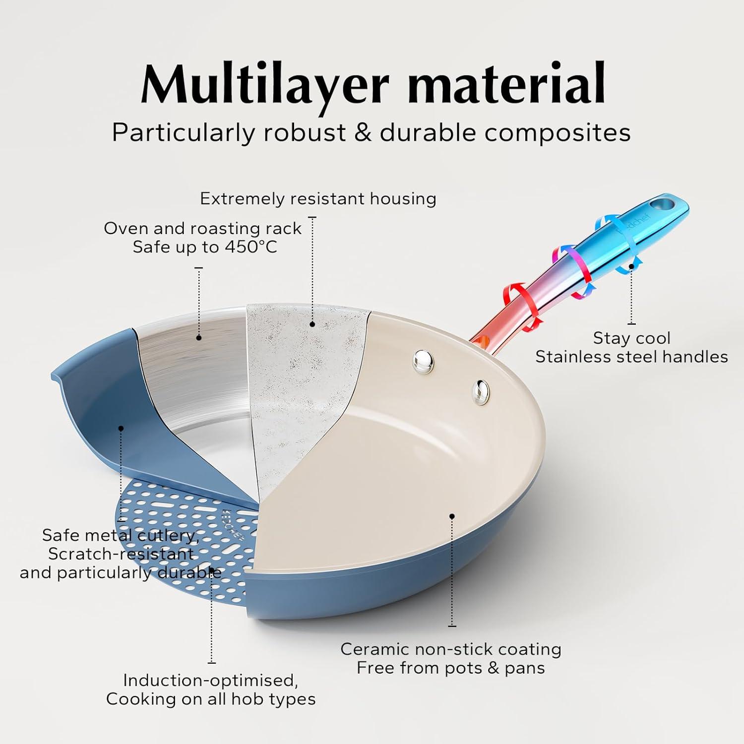 - COOL & STURDY HANDLE: Crafted from lightweight, precision-pressed stainless steel, this ergonomically designed handle ensures a comfortable grip. Double-riveted for exceptional strength and maneuverability, the ceramic skillet pan empowers you to seamlessly transition from stovetop to oven, allowing you to achieve that flawless sear, brown toppings, or even bake