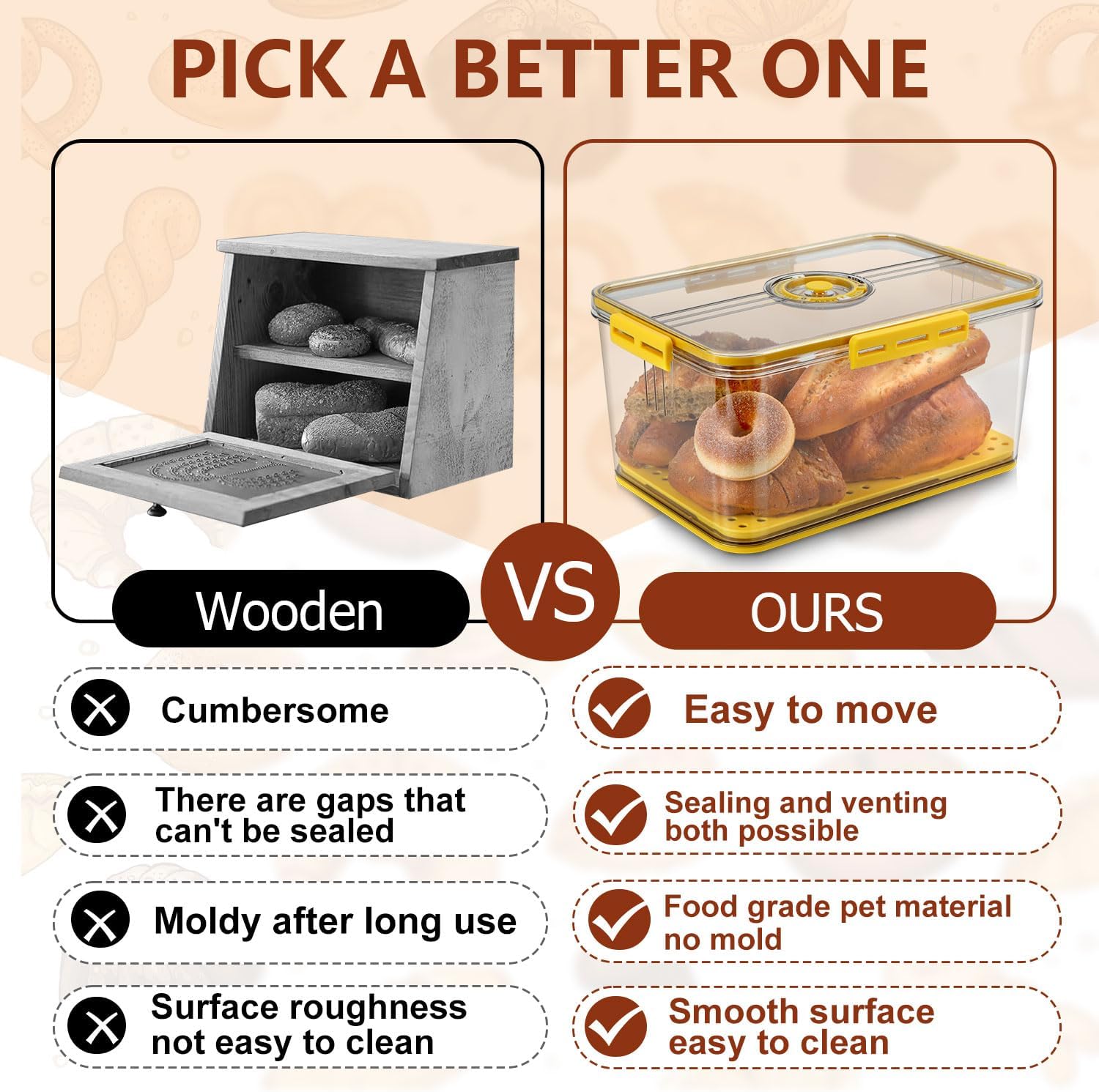 Airtight Bread Box - Clear Plastic Bread Keeper, Fresh Storage for Kitchen Countertop, Large Yellow