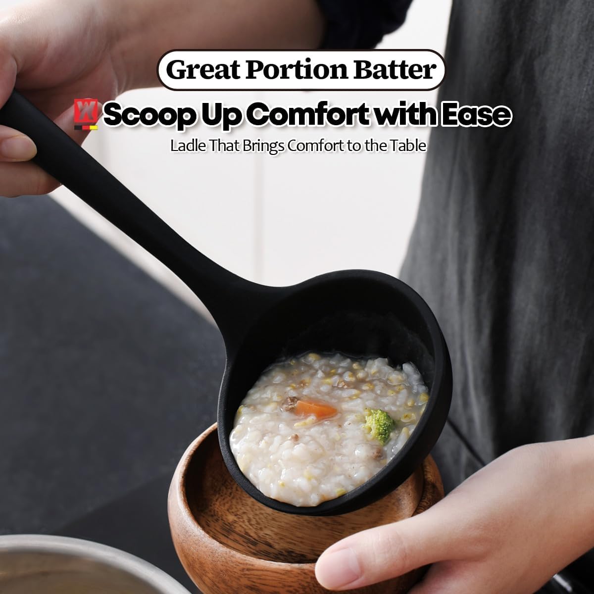 Set of 2pc Silicone Cooking Utensils: Wooden Handle Ladle + Long Head Serving & Cooking Spoon, Heat Resistant, BPA Free, Scratch-Resistant Surface Design
