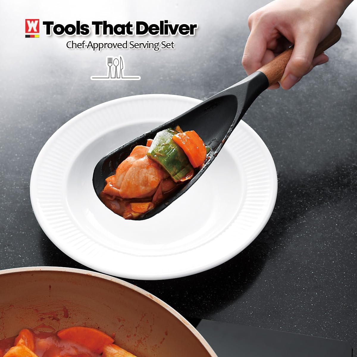- PREMIUM QUALITY AND DURABILITY: Both utensils feature high-grade, heat-resistant silicone heads paired with sturdy, non-slip wooden handles, ensuring long-lasting use without scratching or damaging your cookware.