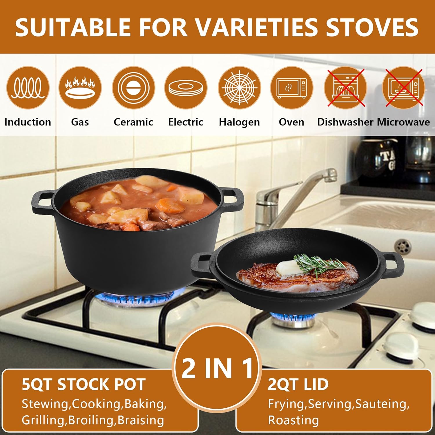 E-far Pre-Seasoned Cast Iron Dutch Oven, 5 Quart 2 in 1 Dutch Oven Pot with Skillet Lid and Silicone Bread Sling, Ideal for Bread Baking, Cooking, Stewing, Frying, Induction & Oven Safe - Black