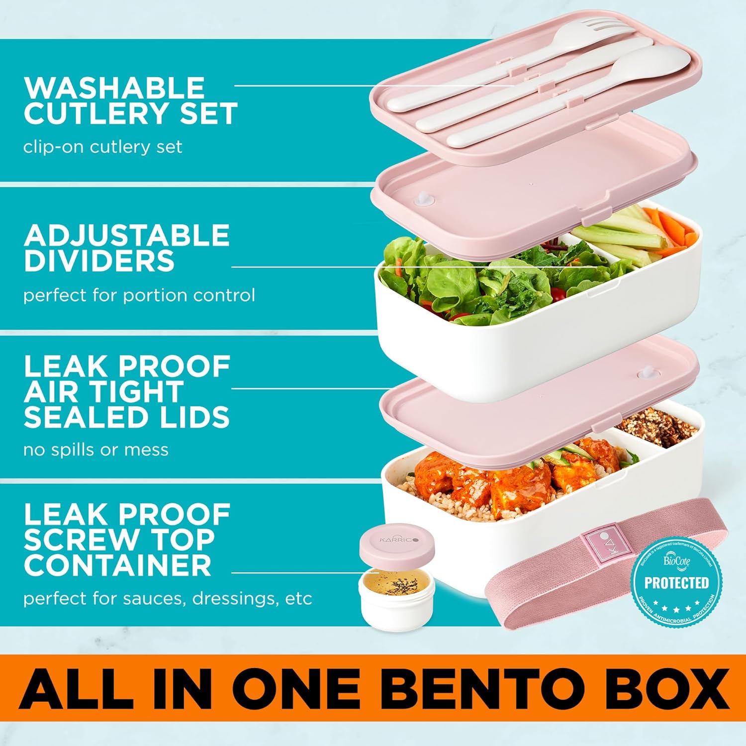 - BIOCOTE PRODUCT PROTECTION - Food leaving a lingering smell in your lunchbox is always a worry. The BPA free, leakproof and food contact safe surfaces of KARRICO bento boxes have BioCote technology that helps protect against stains and bad odors. *BioCote technology does not protect users or others against disease-causing germs, and other harmful organisms. This technology is not a substitute for good hygiene and/or cleaning practices.