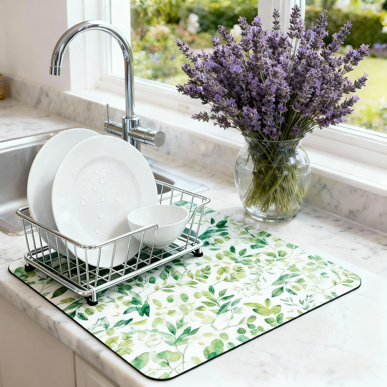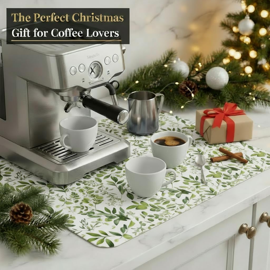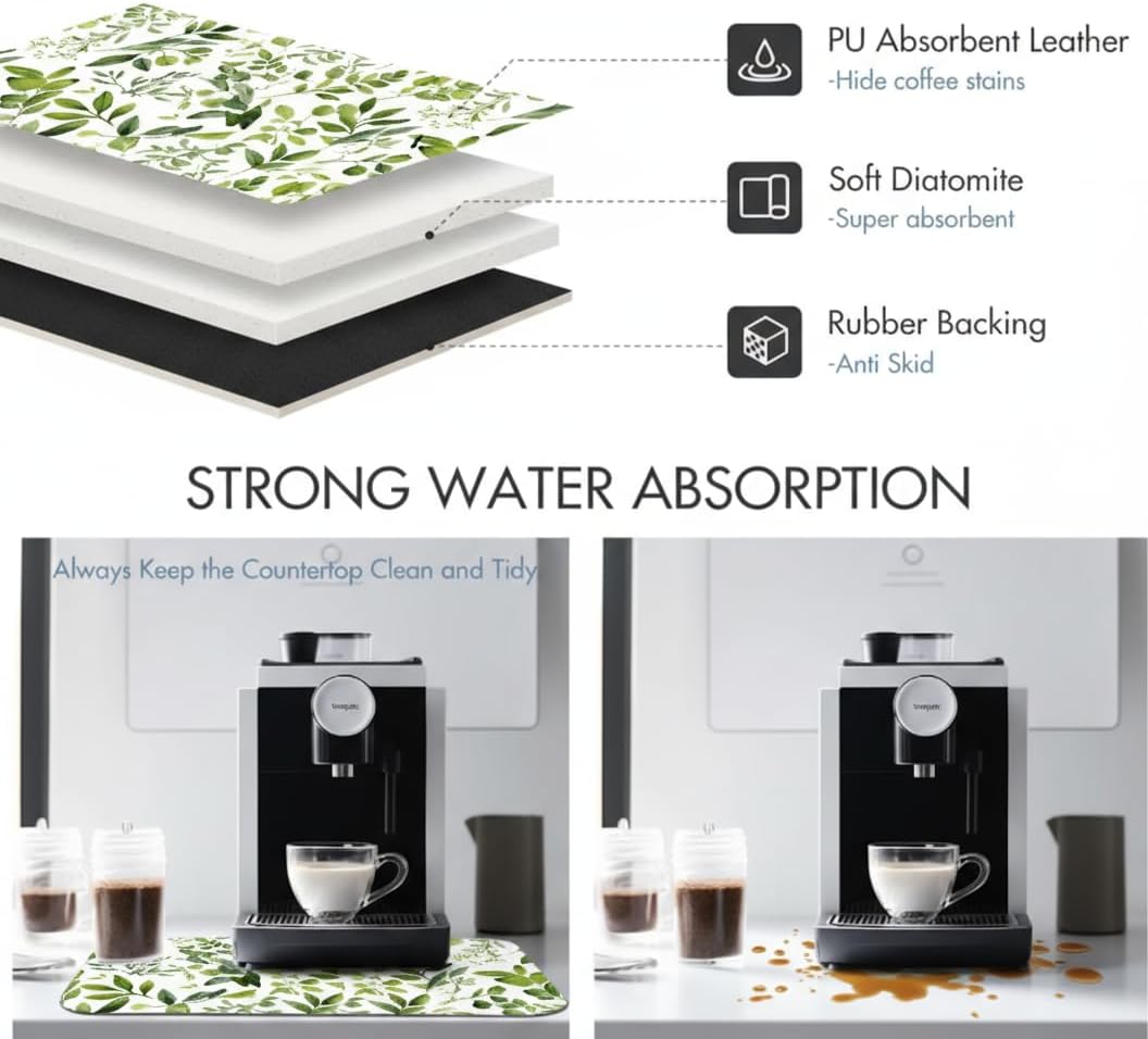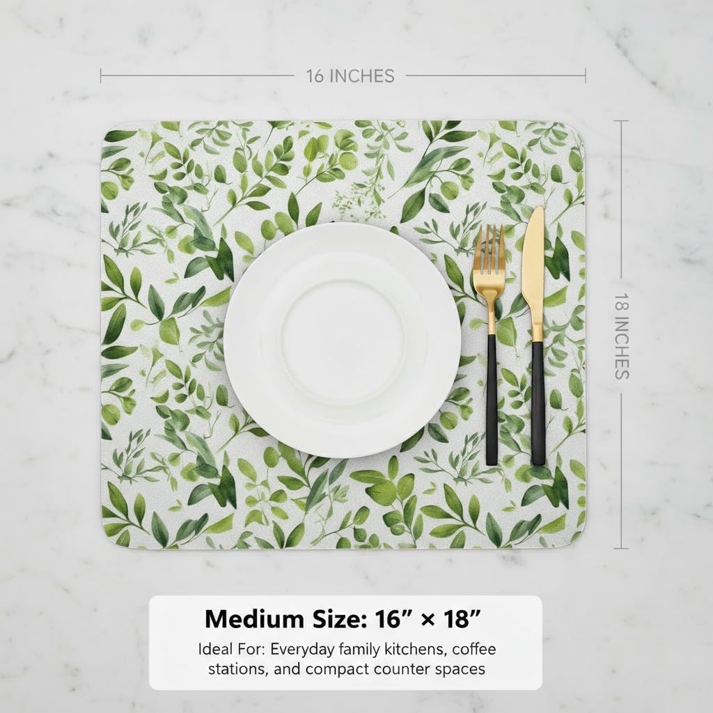 Dish Drying Mat Super Absorbent – 16" x 18" Coffee Mat for Countertops – Non-Slip Drying Mat for Kitchen Counter – Easy to Clean Water Absorbent Mat – Quick Dry Dish Mats (Green Leaves)