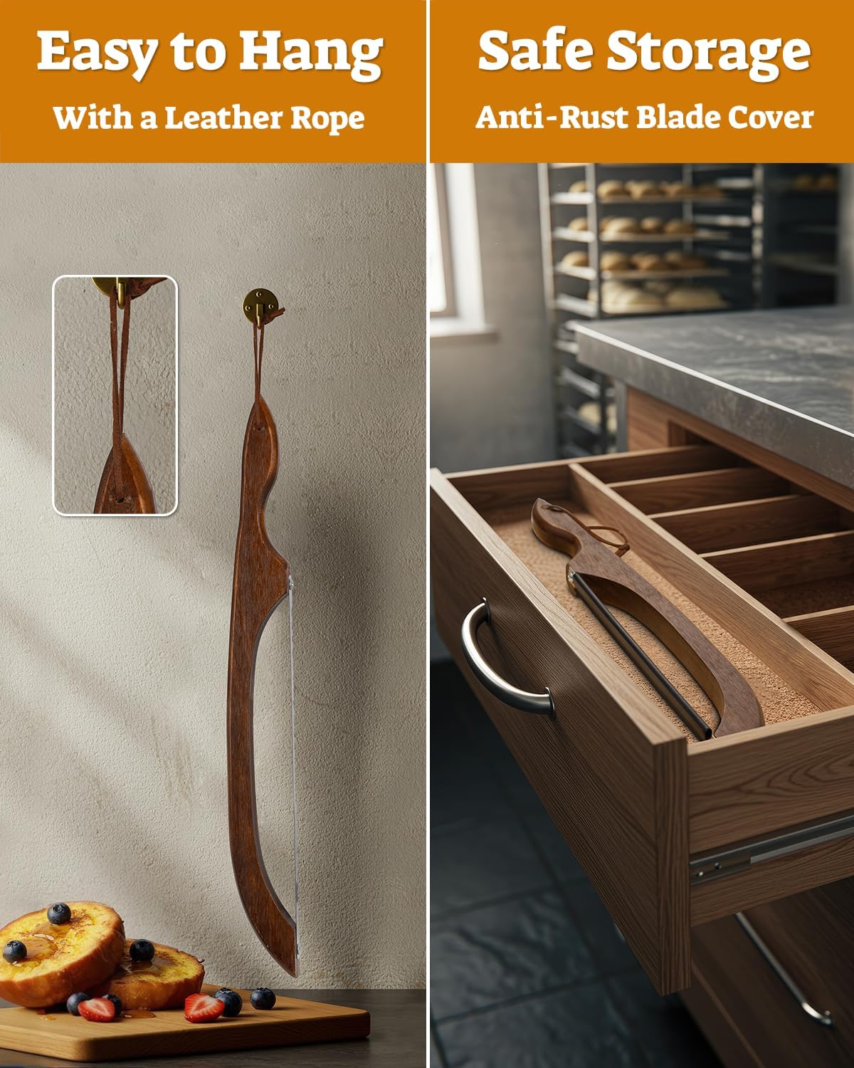- Sharp Blade with Serrated Saw: The bread baking supplies feature an exceptionally sharp serrated blade that effortlessly slice through all types of bread. The bread cutter for homemade bread saw-like edges ensure clean, precise cuts without tearing or crushing, making it perfect for crusty loaves and soft pastries alike. For added safety, the bread slicer for sourdough rounds comes with a protective sheath to prevent accidental cuts when stored