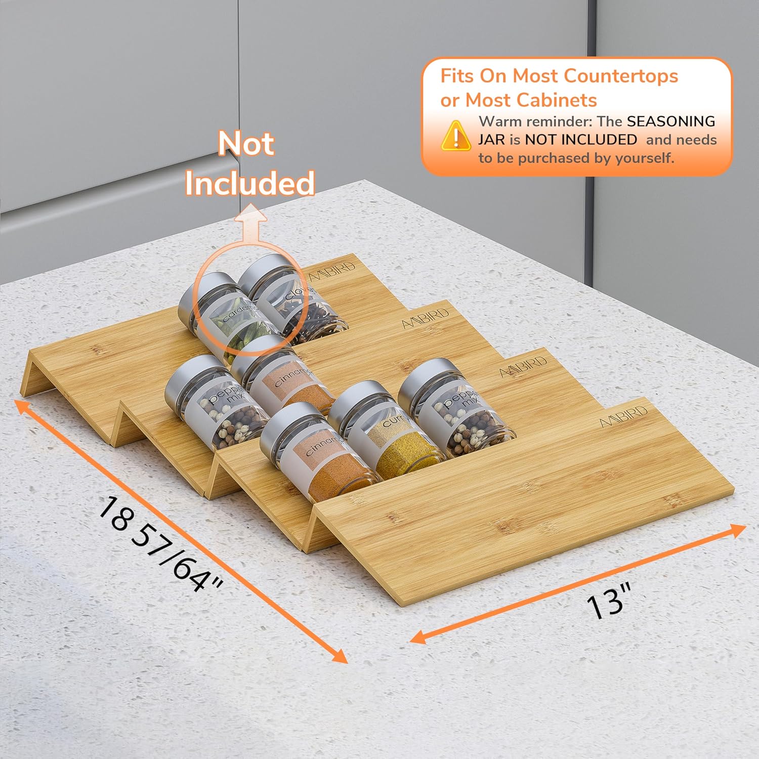 AMBIRD Bamboo Spice Drawer Organizer with Non-slip Mat, 4 Tier Jar Spice Rack Tray 13'',Seasoning Organizer for Kitchen,Cabinet,Drawers,Countertop