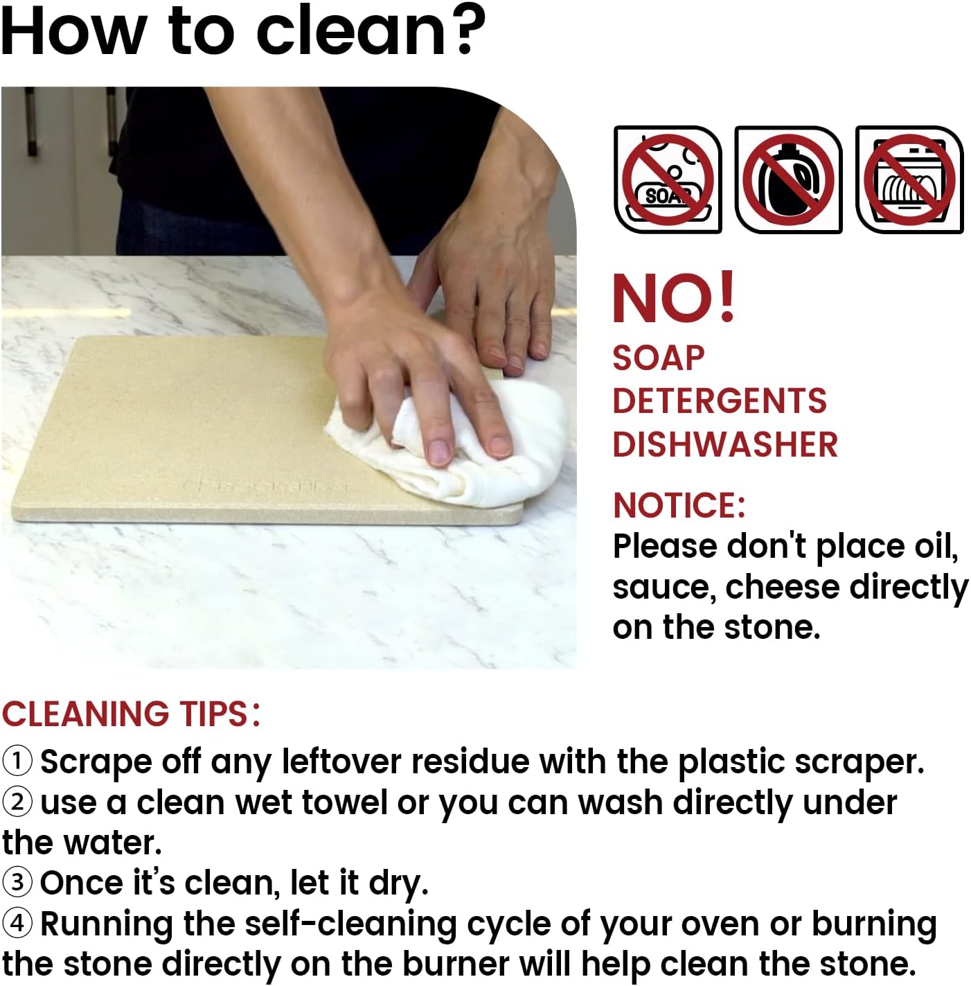 - FDA, RoHS, LFGB, etc CERTIFICATED. This stone is burned in 2200℉ kiln, it doesn't contain any harmful substance and has no odor. (Never use soap or detergent to clean the stone! Never season cordierite stone with oil or grease)