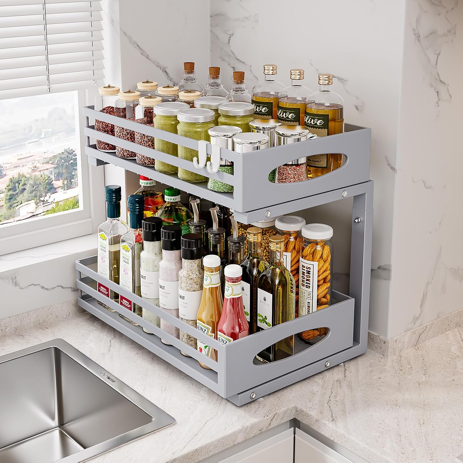 - ăDouble Sliding DesignăThe 2-tier pull-out under sink organizer and storage allows you to pull out the basket smoothly without effort. It enables easy access to items you need without any hassle
