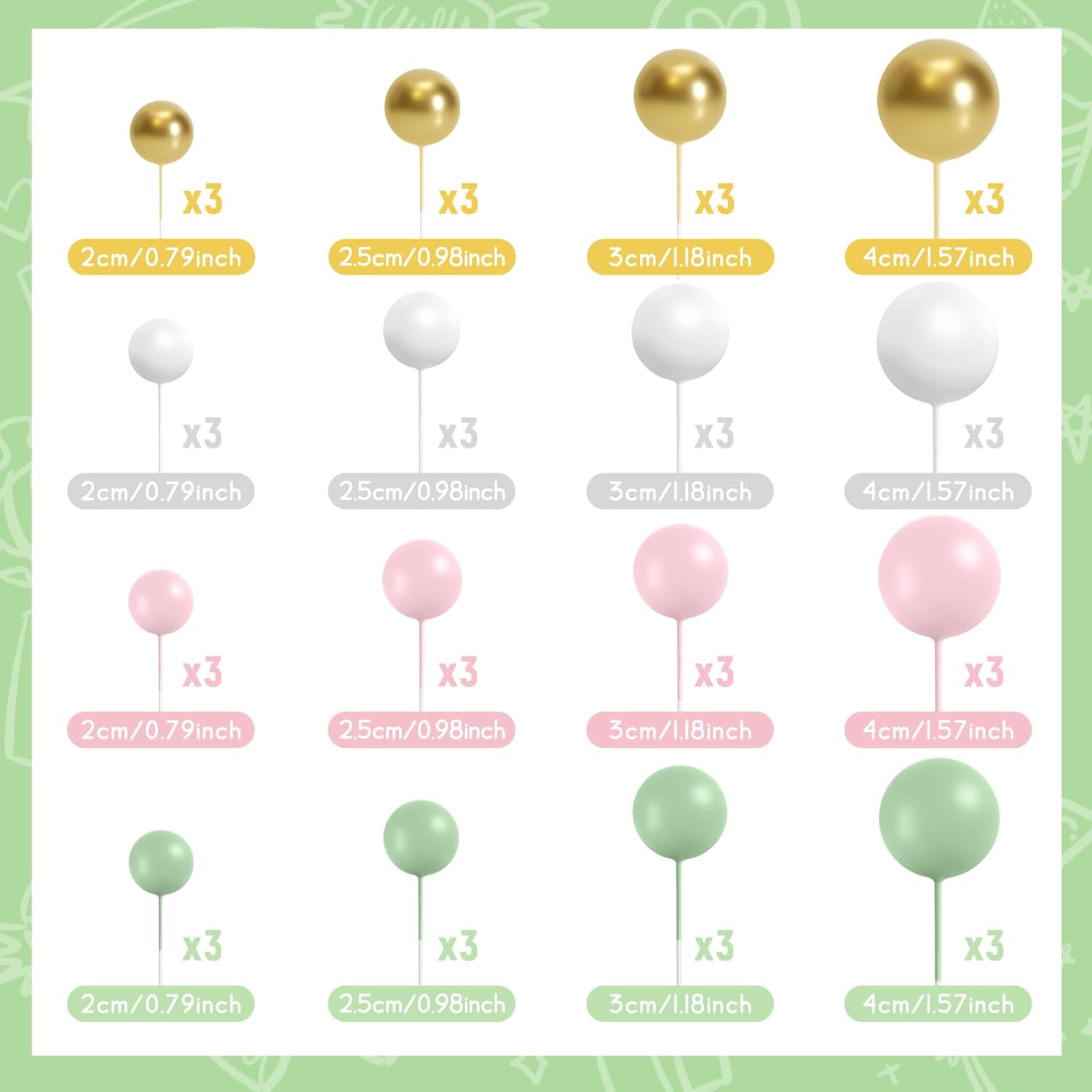 48 Pcs Balls Cake Topper Decorations Balloon Cupcake Toppers Foam Cake Topper Balls Cake Balls Decorations for Birthday Party Wedding Cake Decorating(Green,Pink,White,Gold)