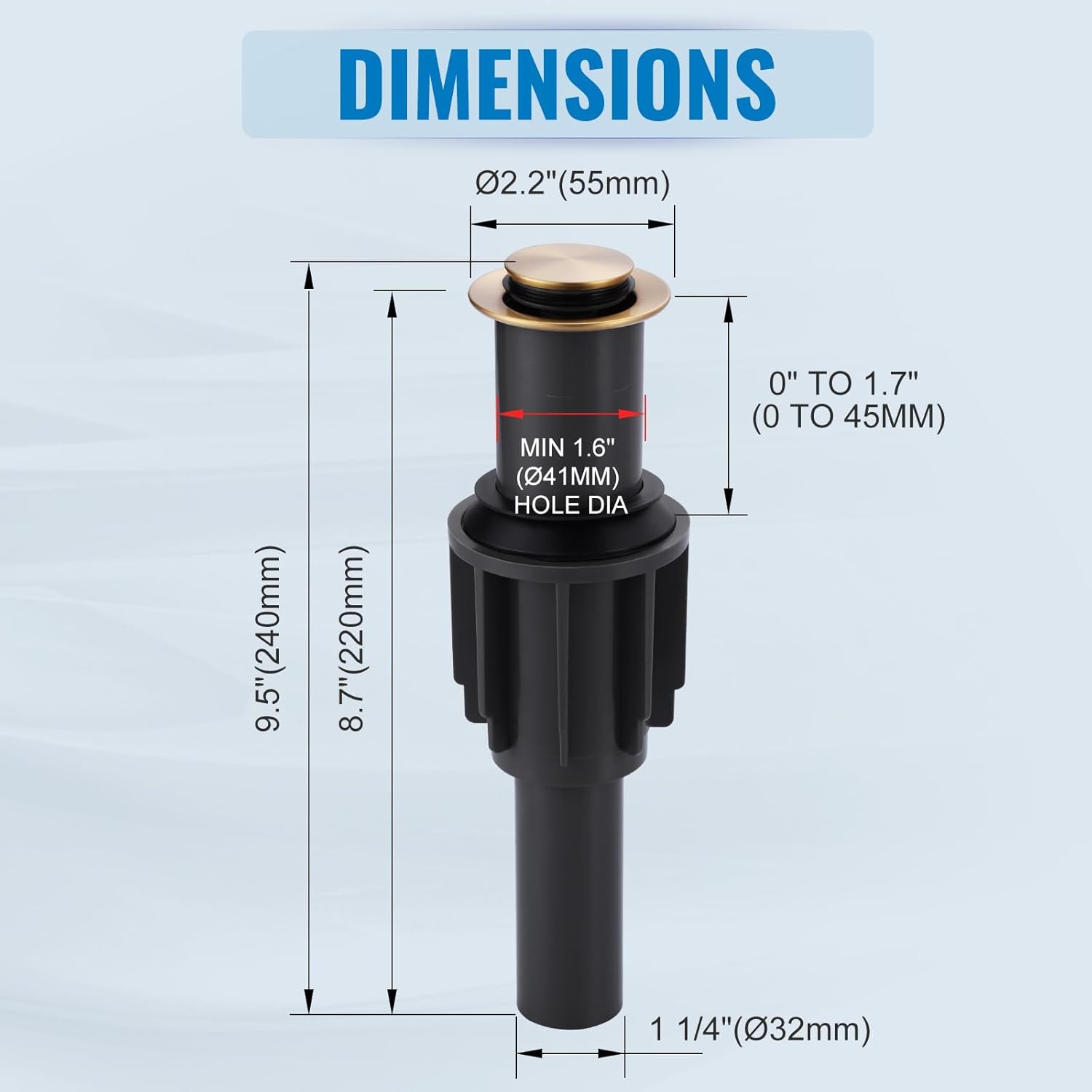 - Standard US Drain Hole Size - The bathroom pop up drain designed for sink without Overflow, it is standard sized US plumbing fit Drain Opening from 1 1/2" to 1 3/4" and tailpiece nut size 1 1/4". Please check and confirm your size before purchsing.