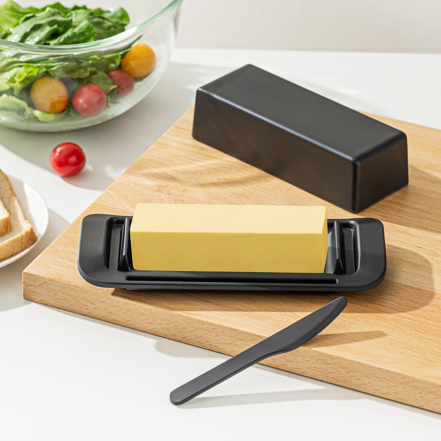 Butter Dish with Lid for Countertop, Butter Dish with Knife, Butter Keeper for Kitchen or Fridge, Bamboo Fiber Butter Tray, Butter Holder for 1 Stick Butter, BPA-free, Dishwasher Safe(Black)