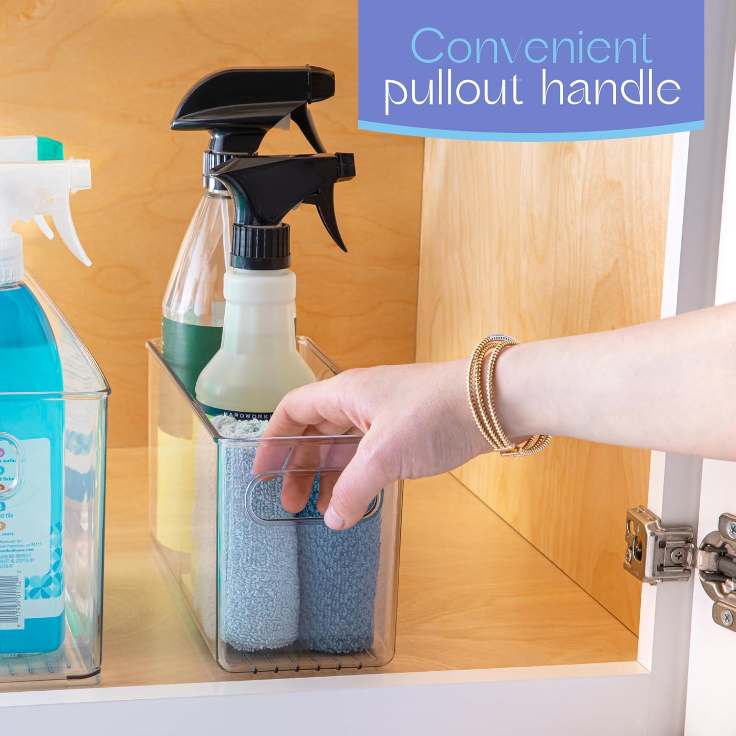 6 pack Clear Plastic Storage Container Bin with Integrated Easy Grip Handles. For Kitchen, Fridge, Freezer, Cabinet, Pantry, Bathroom Organization. 10"x4"x5"