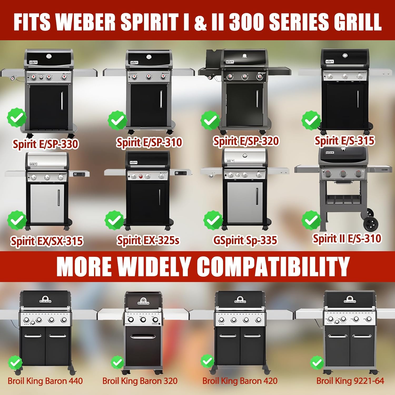- WIDE COMPATIBILITY: The Cooking griddle measures 23.4" x 17.3" x 1.6" and is compatible with Spirit I & II 300 series 3-burner gas grills, for Weber Spirit E/SP-310, E/S-315, EX/SX-315, E/SP-320, E/SP-330, Spirit EX-325s, Spirit SP-335. Also fits Broil King Baron 300/400 series 2013 & newer; fits Broil King Crown 300 400 series 2012 & newer; fits Broil Mate, Sterling and Huntington Rebel Patriot 3/4/5 burner gas grills.
