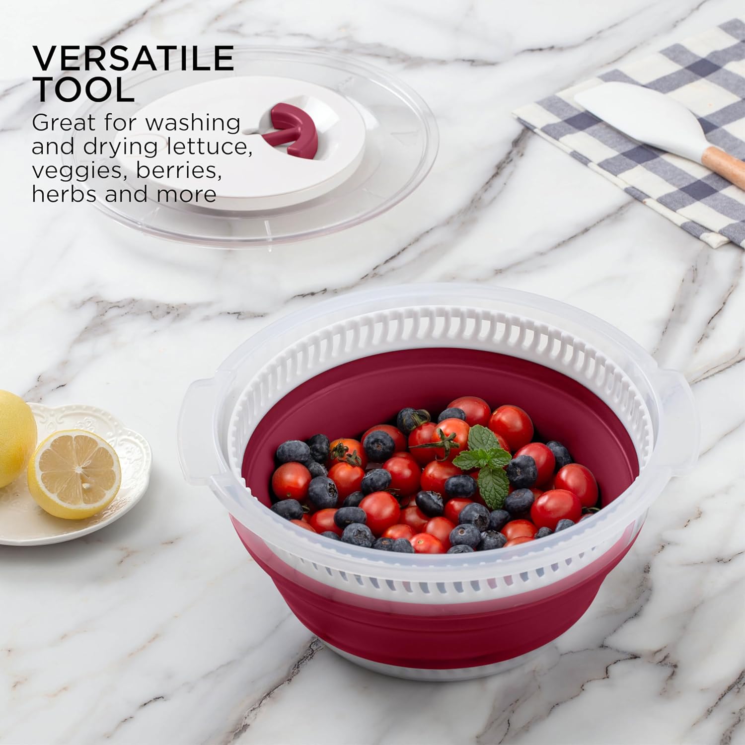 - Multifunctional Salad Spinner: This is not your ordinary salad spinner. It's also a collapsible bowl and colander, making it a versatile addition to your kitchen. Use it as a salad spinner to dry your lettuce and then easily transform it into a bowl for serving. Also works great as a berry spinner!