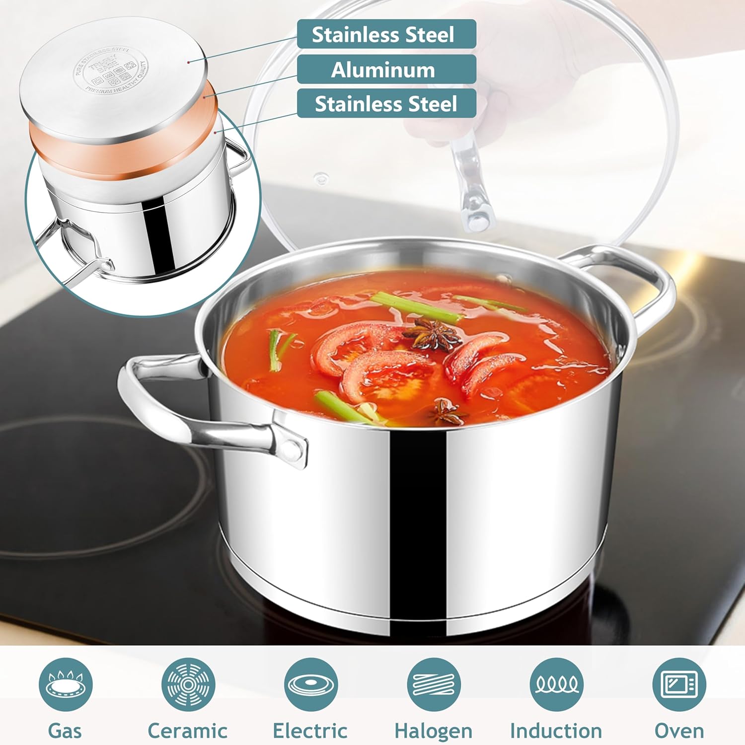 - TRI-PLY BOTTOM: Tri-ply clad base construction with an aluminum core for quick and even heat distribution, Preventing hotspots and scorching, Compatible with all stoves, including induction, gas, electric, ceramic, Oven safe up to 500β (except lid), Perfect for recipes that start on the stove and finish in the oven