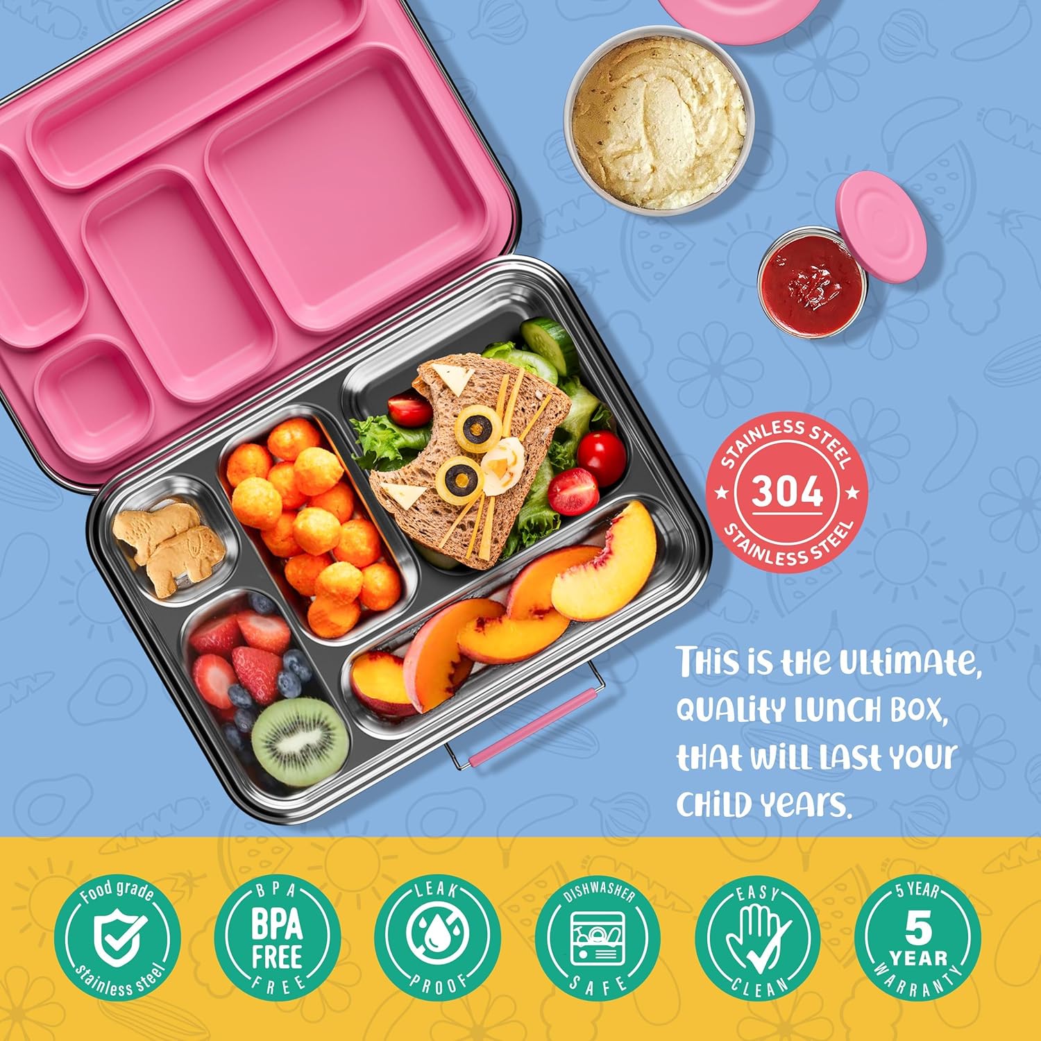 - Durable stainless steel silicone combination: Made from high-quality 304 stainless steel with an LFGB silicone seal, this bento box is dishwasher safe and built to last with a 5-year warranty.