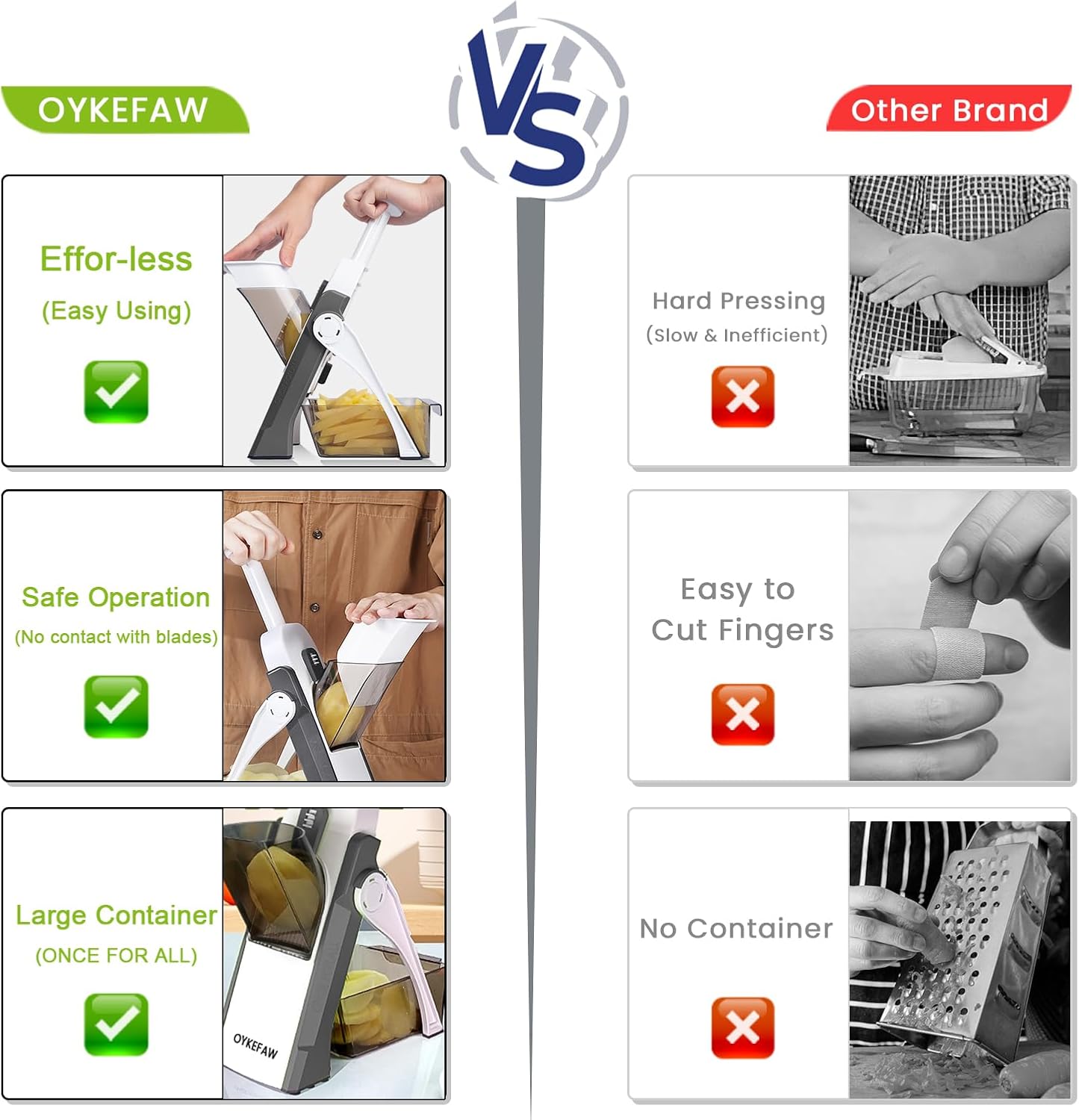 - Safe Mandoline Slicer: Safe slicer for any cook, The blades of our vegetable cutter are separate and hidden .With the build-in blades design, no need to touch the blade, safe and more assured, triangular structure stand for more stable, more labor-saving. It quickly slices, strips, julienne and dices.