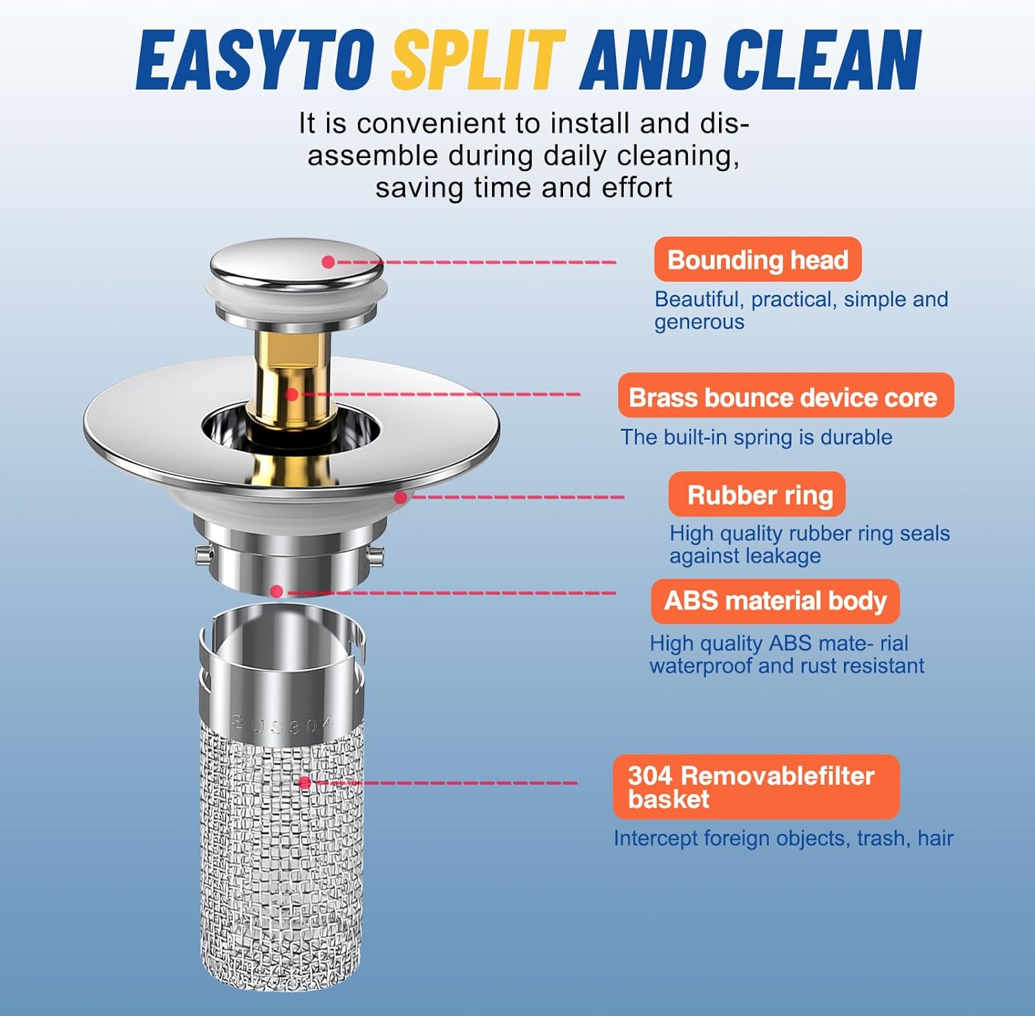 - 【UPGRADED 2-IN-1 DESIGN】The pop-up bathroom sink drain strainer features an anti-clogging basket inside, combining a stopper and a strainer in one.clogging basket that captures hair and other debris, preventing them from entering the drain.This helps to maintain efficient drainage and prevents clogging issues.