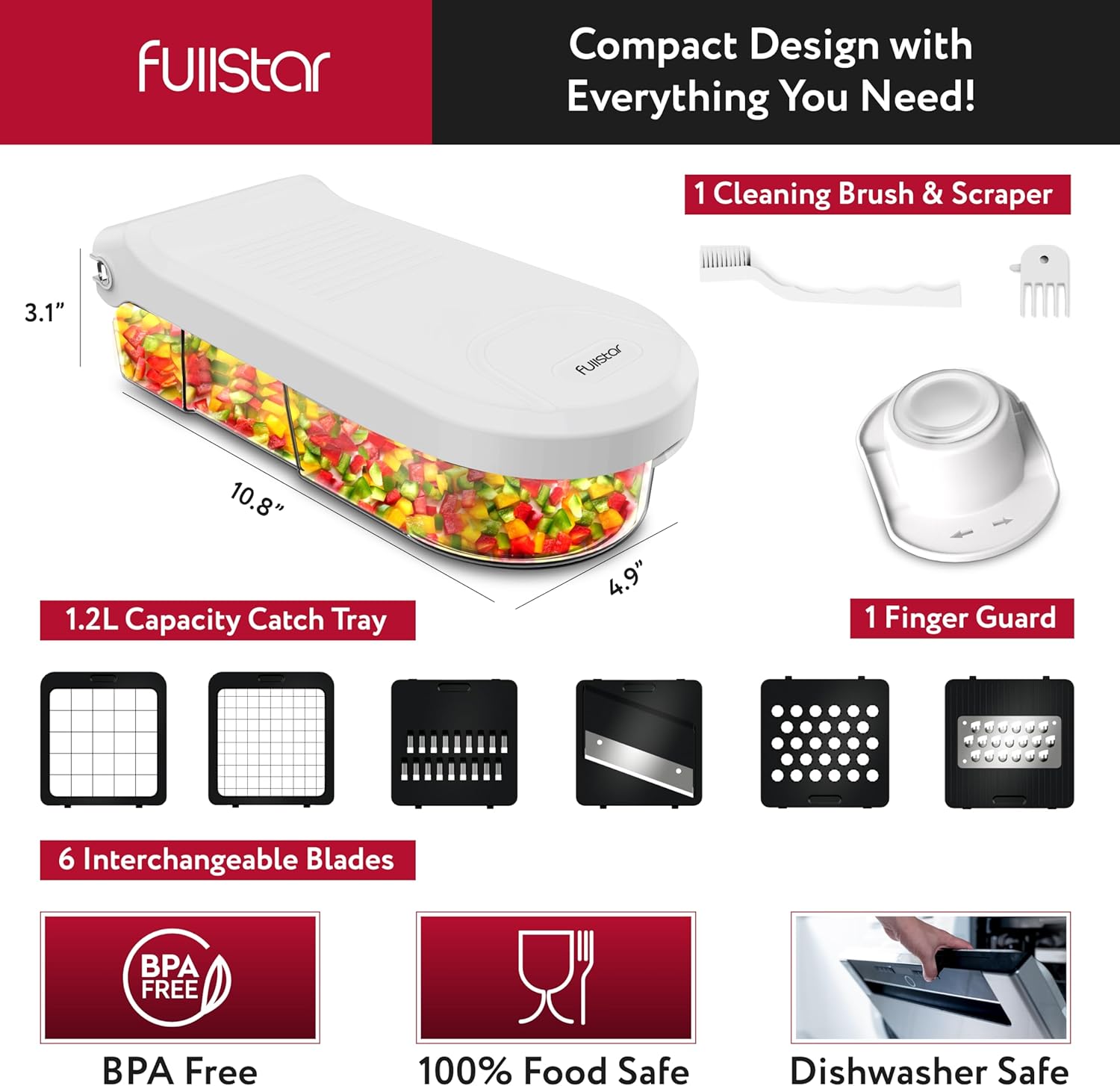 - Great Value & Quality - The Fullstar vegetable chopper is an affordable mandoline slicer and cheese grater that doesn't compromise on quality. It includes 6 stainless steel blades, 1 cleaning brush, 1 finger guard, and a 1.2L container for safe and efficient meal prepping.