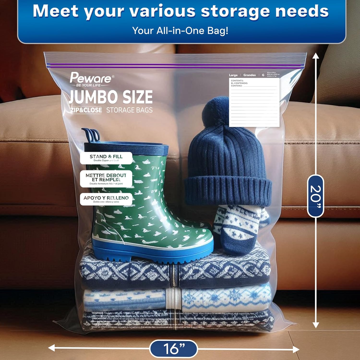 - EXTRA LARGE 16X20 INCHES SIZE: Perfect for storing bulky items like blankets, pillows, or large batches of food. With a 3-gallon capacity, these bags are the ultimate solution for heavy-duty storage needs.