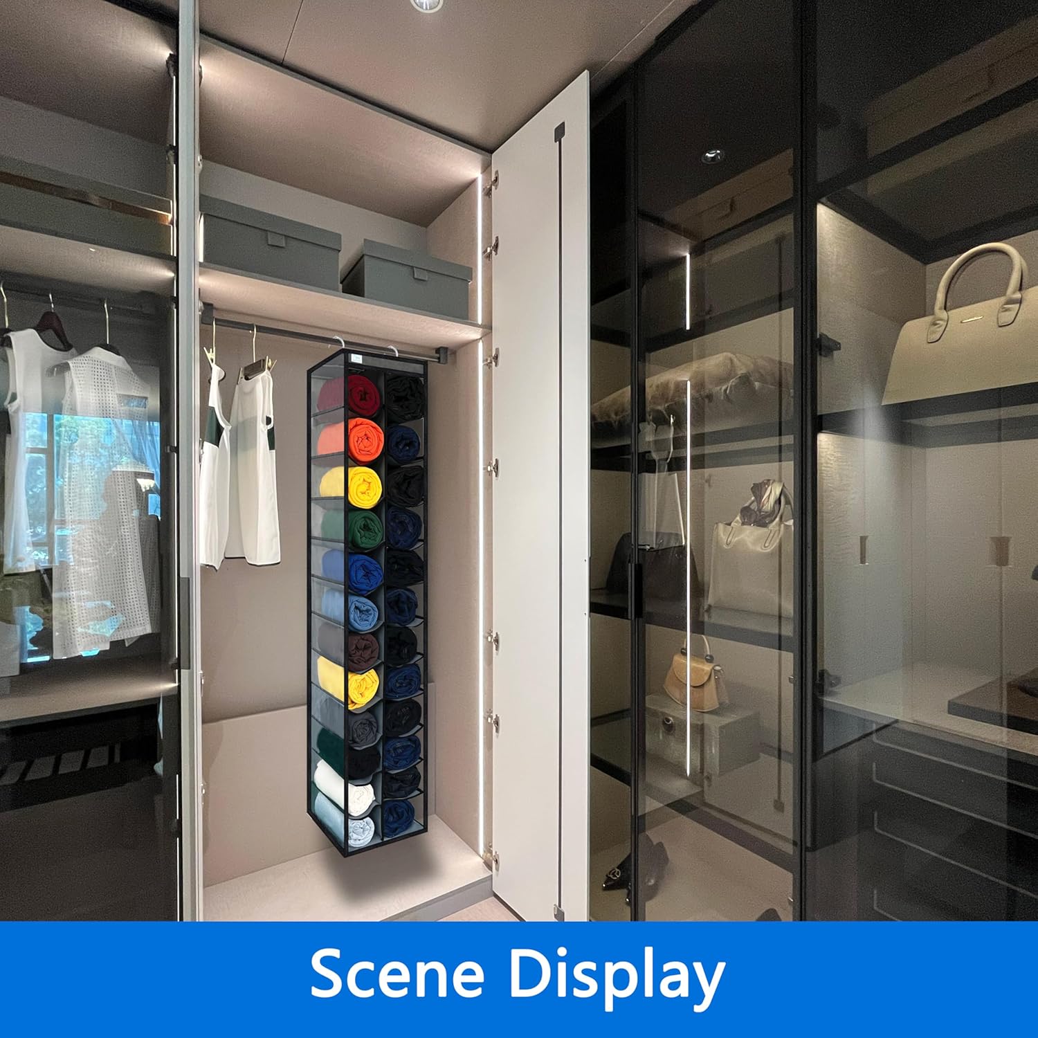 - 【Space-Saving Design & Attractive Appearance】hanging closet organizer, The hanging design means it doesn't take up any floor space, which is a huge plus for smaller closets. It maximizes vertical space, allowing you to store more items without cluttering the floor.Visualization modern design make it a stylish addition to any closet. It blends seamlessly with you other storage solutions and adds a touch of elegance to you wardrobe.