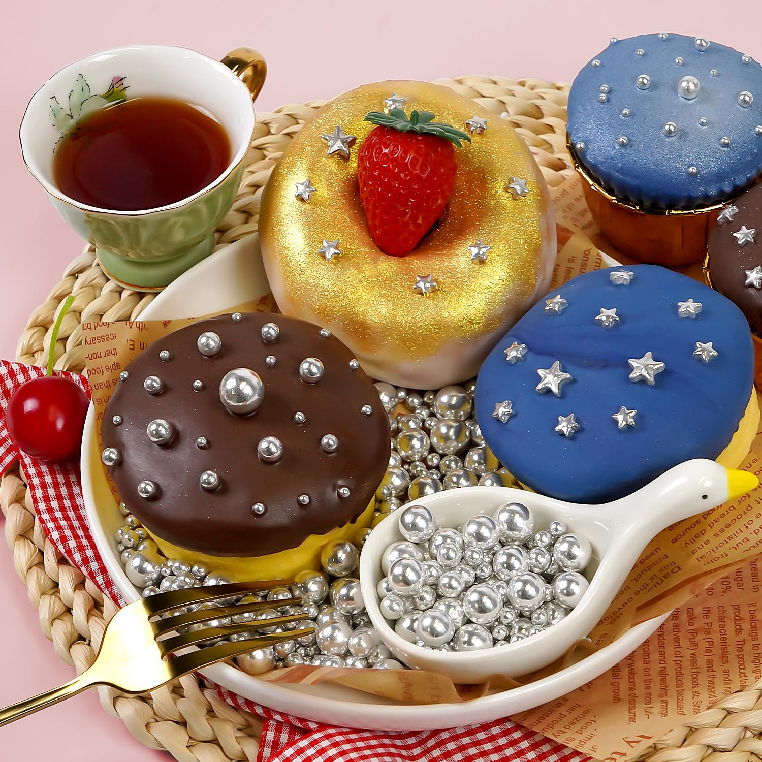 - Great for cake decorating, cookies, cupcake toppers, ice cream, donuts, waffles or milkshake. Silver Pearl Sprinkles make the food more delicate and beautiful. Make your baked goods look more appealing with these silver pearl sprinkles. Metallic Silver Pearl Sprinkles are good for all kinds of festival baking and decorating.