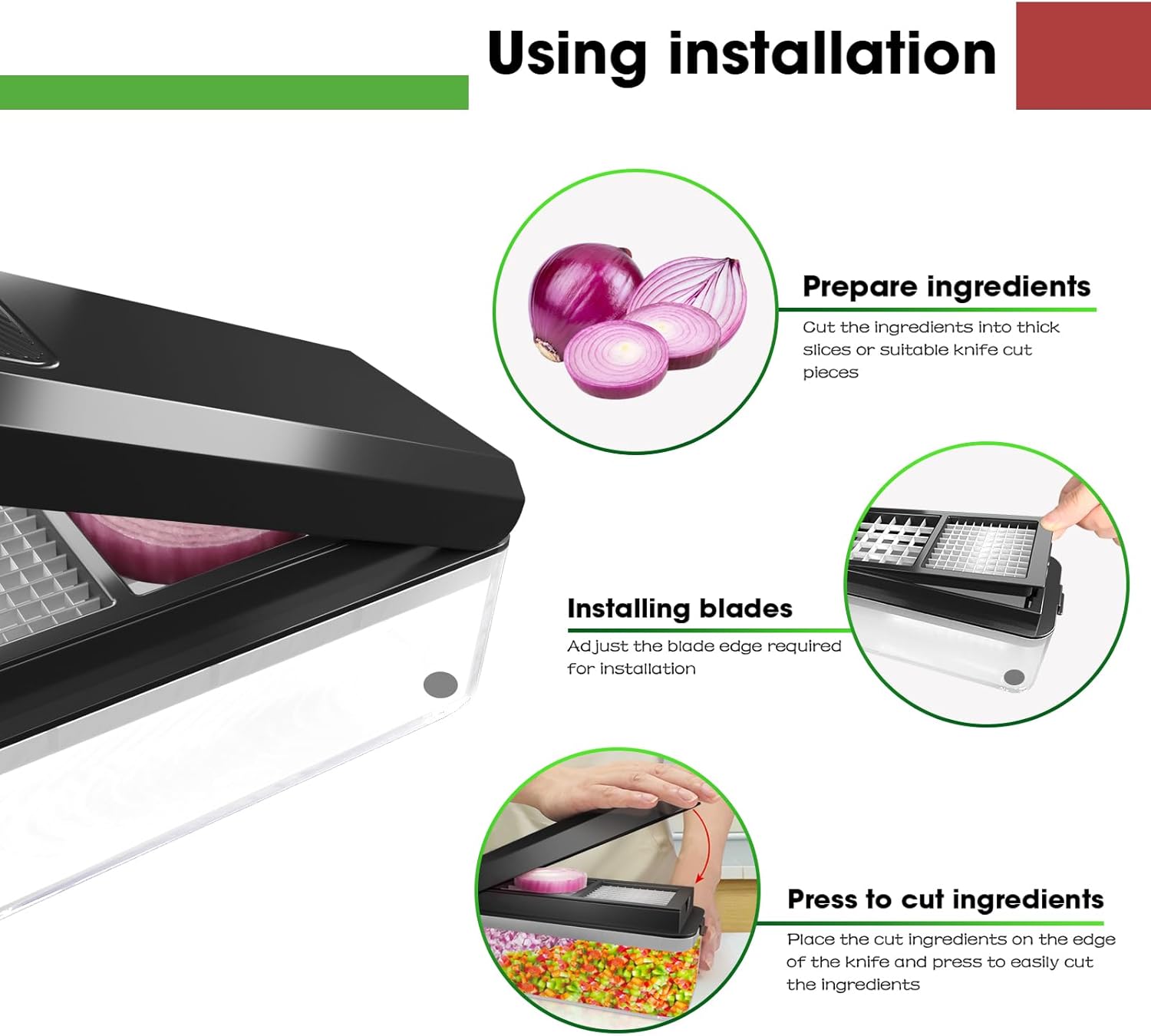 - SAFE AND USER-FRIENDLY DESIGN: The onionchopper prioritizes safety during use. It is equipped with a hand-held protective tool to prevent hand injuries. The blades are designed for easy insertion, removal, and locking, ensuring stability and safety. The non-slip bottom of the storage container enhances safety.