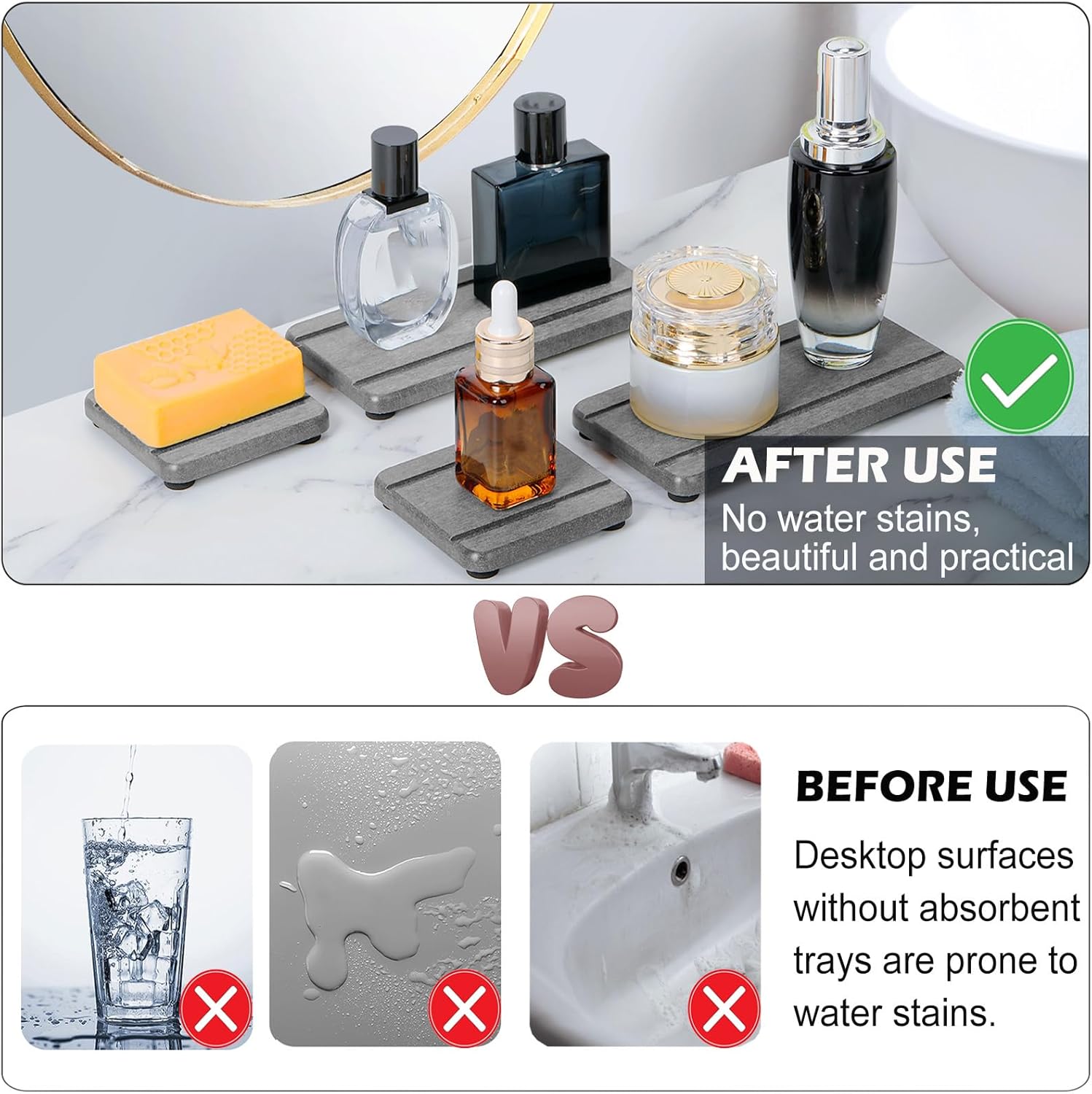 - Elegant Design & Multi-use --- In addition to its incredible water absorption function,our stone soap tray is also the perfect decor for home, adding a touch of order and elegance to your living space.You can use the stone drying tray as hand soap dish,bar coasters,dish washing sponges trays,makeup bottles coasters,cosmetic bottles soap bottles tray,or anywhere you need to quickly absorb water and keep the surface of the countertop dry.
