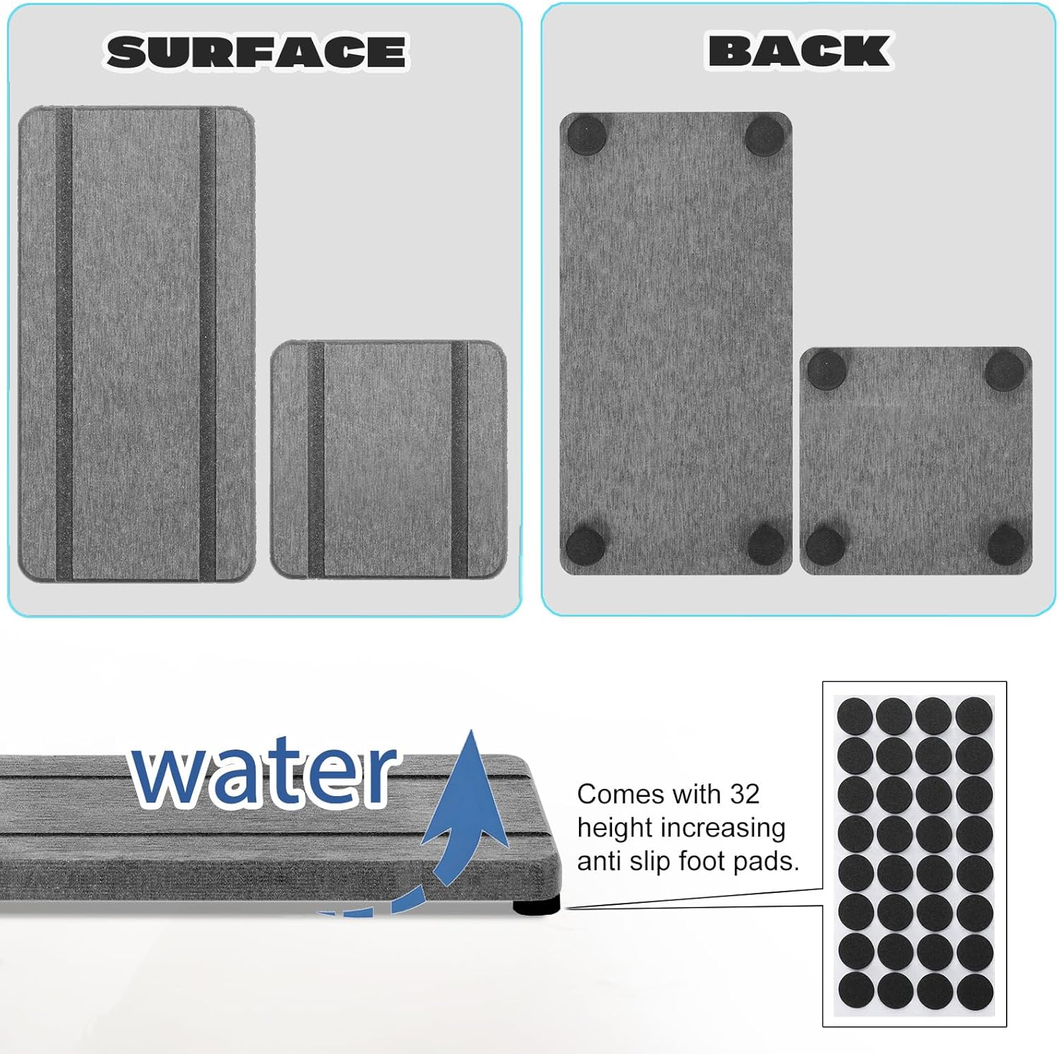- More Anti Slip and Ventilated --- The silicone footpads boost the slip-resistance of absorbent stone coasters while keeping them out of the bathroom vanity. This design improves the contact surface between diatomaceous earth coasters and air, accelerates the evaporation of water, and extends the service life of the water absorbing stone tray for sink.