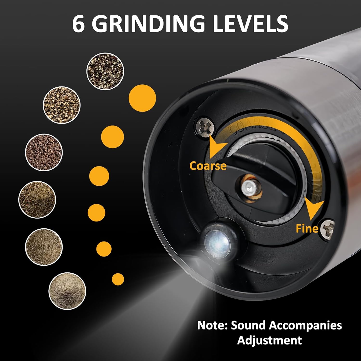 - Six-Level Coarseness Adjustment: These electric salt and pepper shakers feature a six-level adjustment knob, allowing you to easily select the grinding coarseness to meet various cooking needs. The high-quality ceramic core ensures the original flavor of the spices. Whether in the kitchen, at a restaurant, or during a picnic, this grinder is the perfect assistant for enjoying flavors anytime!