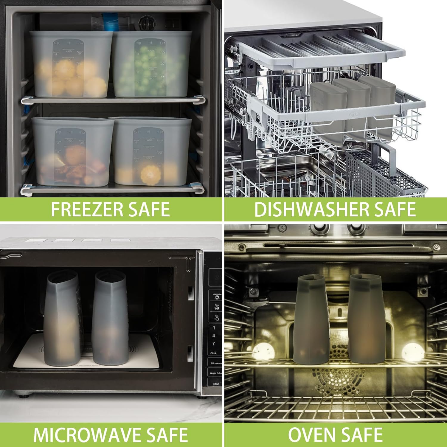 Reusable Storage Bags Quart Size, 4 Pack, 100% Silicone Stand Up Ziplock Reusable Silicone Food Storage Bags Sandwich Bags Containers, Freezer Microwave Oven Dishwasher Safe, Grey, 33.8fl.oz
