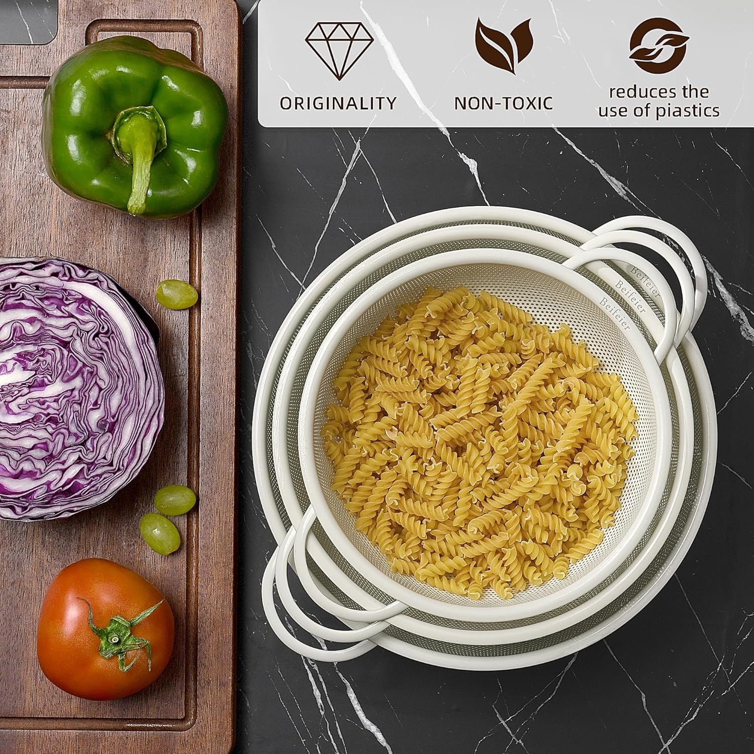 - Stainless Steel Colander 3 Pack: BeFare kitchen colander set include 2-Quart 3-Quart and 4.5-Quart for all your cooking, straining and preparation needs.We can use it in family gatherings, outings, and picnics, also a perfect idea kitchen decorations.