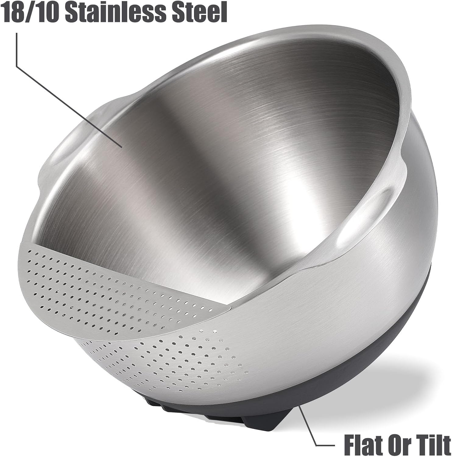 18/10 Stainless Steel Rice Strainer Washer Bowl Versatile Good Grips Colander Tiltable Side Drainers for Washing Cleaning Rinsing Fruits, Vegetables, and Beans - Non-slip Silicone Bottom