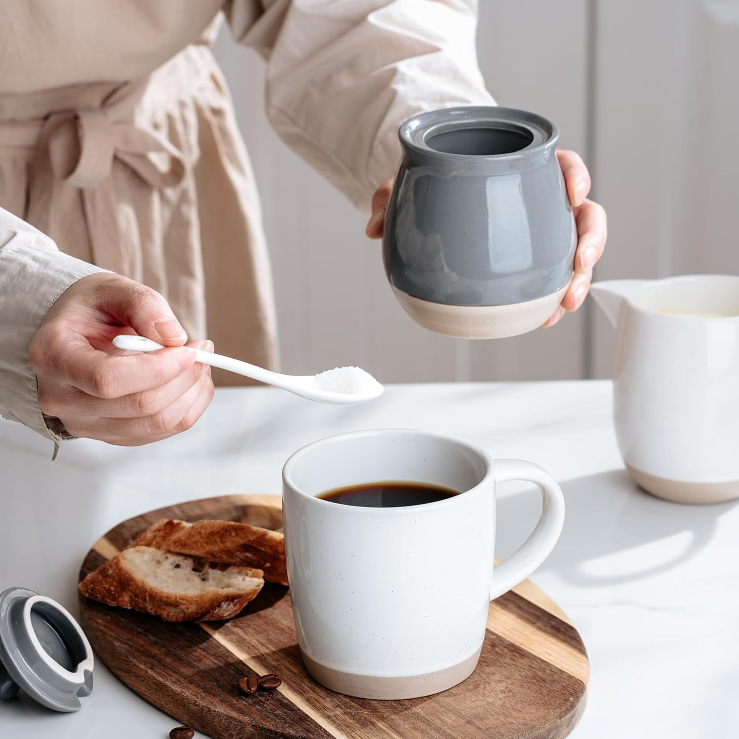 - Thoughtful Design: This sugar bowl comes with a snug-fitting lid and a handy mini spoon. The lid keeps sugar fresh and dust-free, while the spoon ensures precise portions without messy hands. Plus, the built-in spoon rest keeps everything tidy, and the wide-mouth design makes filling and scooping effortless.