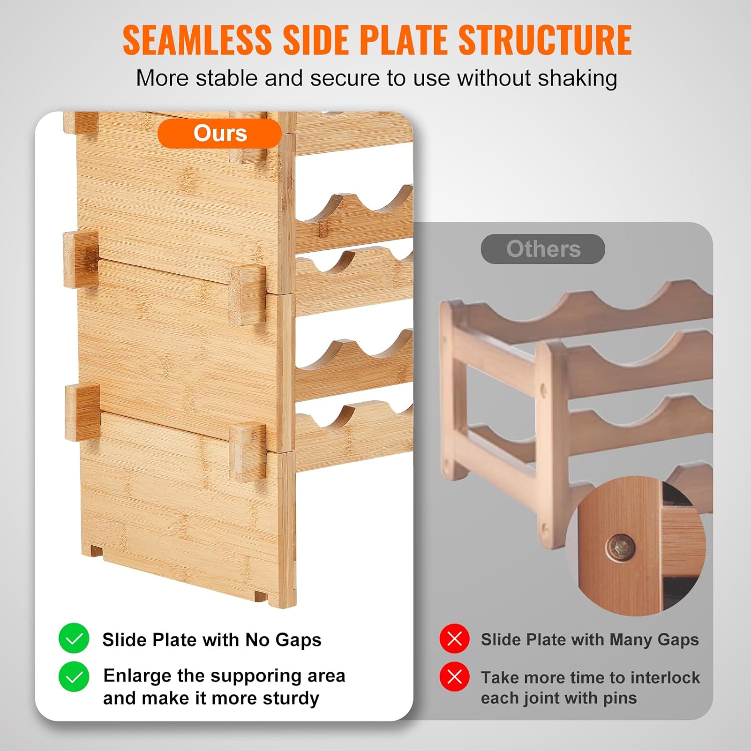 - Natural Bamboo Wood: Our wine storage rack is made from high-quality bamboo, which is smooth, crack-resistant, and less likely to absorb moisture or mold. The natural bamboo has excellent resilience and supports wine bottles perfectly without wobbling.