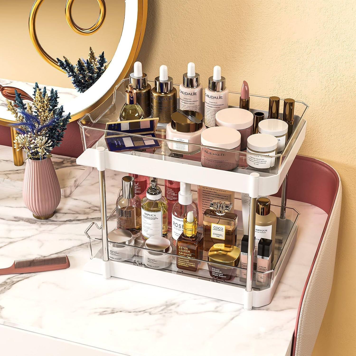 JLKDQ 4 Pack Bathroom Under Sink Organizers and Storage, 2-Tier Pull Out Cabinet Organizer and Medicine Storage Shelf,Fit Cabinets, Kitchens,Food Pantry. (White&Clear,10.63" L x 8.0" W x 8.46" H).