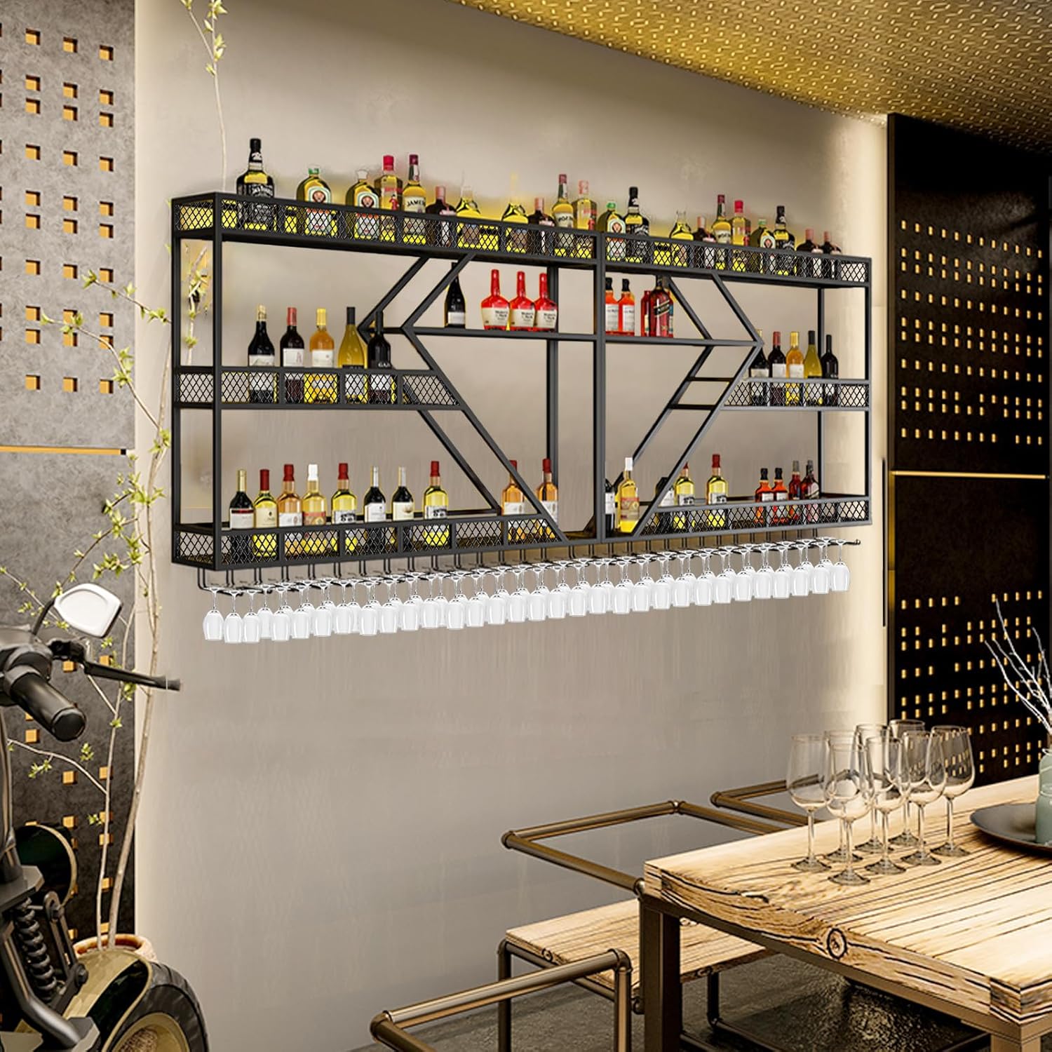 63in Metal Wine Rack Wall Mounted, Modern Wine Storage Rack Wall Mounted with Wine Glass Holder, Liquor Shelf, Bar Shelves for Liquor Bottles (3TIERS Black, 63 * 7.87 * 33.85INCH)