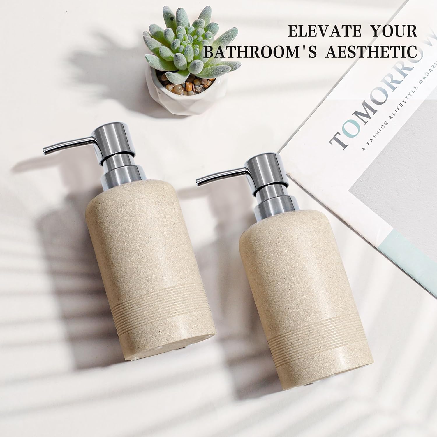 - ELEGANT DESIGN: Crafted from resin to mimic a sandstone surface, this dispenser adds a touch of sophistication to your bathroom, kitchen, or office decor.