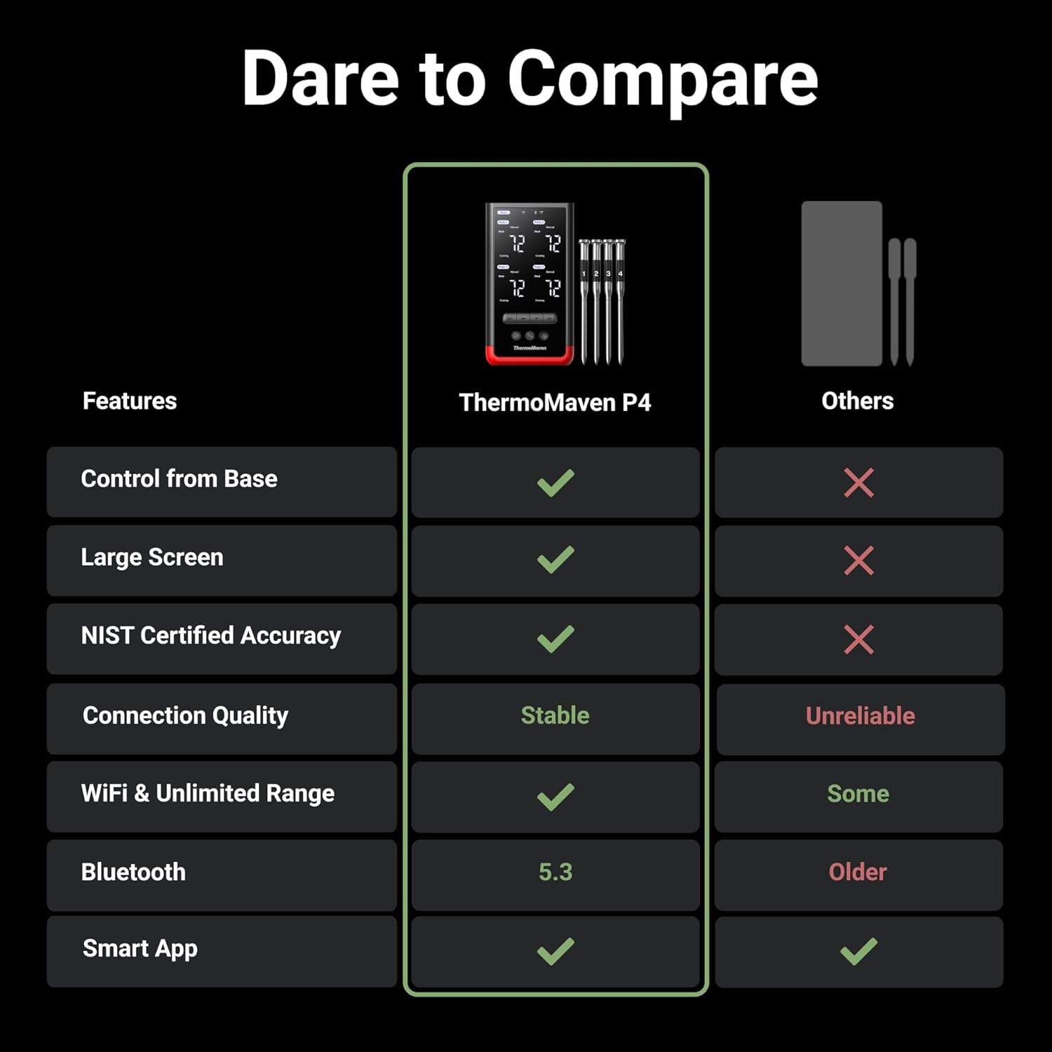 - 100% Wireless Freedom: Kiss tangled wires goodbye with the ThermoMaven P4. Roam freely with Bluetooth long-range connectivity, linking seamlessly from the base to the probes.